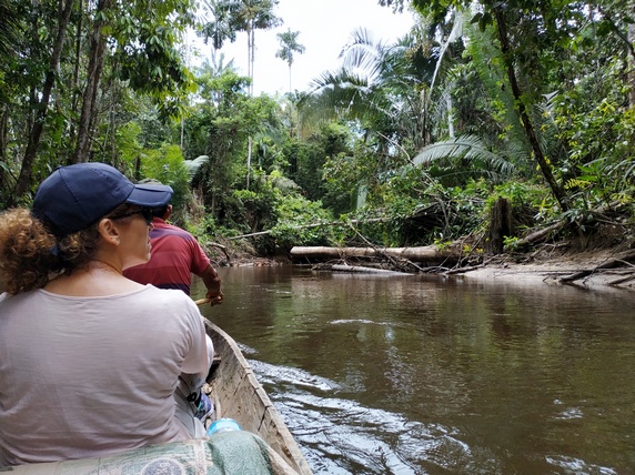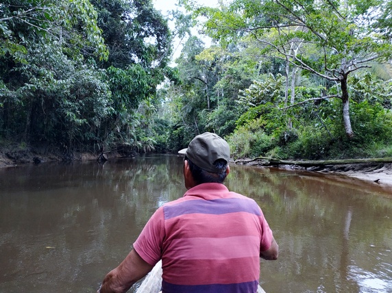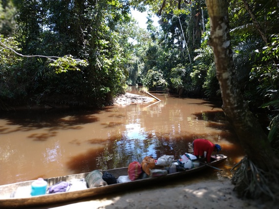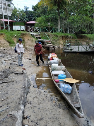 A las ocho de la mañana nos pasa a buscar por el hotel Wellington, nuestro guía. Vamos a desayunar, de camino recogemos a Jovita, que será nuestra cocinera. Pasamos por sus oficinas a coger todo lo necesario para nuestra estancia en la reserva: fruta, pan, leche deshidratada, huevos, fruta, algunas latas, botellas de agua, esterillas y cubrecamas, ropa (nosotros llevamos una mochila pequeña de 15 lt cada uno), botas de agua, utensilios de cocina, los remos… llenamos la parte trasera de un motocarro y vamos hasta la entrada del parque, en