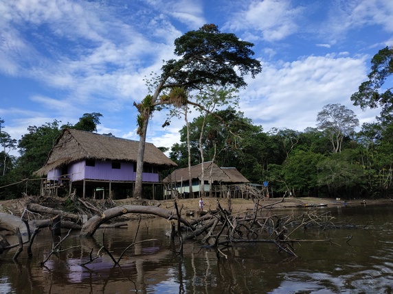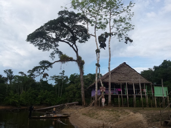 A las 16h llegamos a Poza Gloria donde cenaremos y pasaremos la noche. Es una cabaña muy básica, hecha con madera y techada con hojas de palmera entrelazadas. Está elevada unos tres metros sobre el suelo, tipo hórreo, para que no se malogre en temporada de lluvias cuando el rio sufre notables crecidas. Frente a ella hay un muelle anclado al rio con un sistema que le permite también desplazarse en función de las crecidas del rio.
