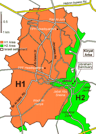 Hebrón (5 IS), una ciudad sagrada para judíos, musulmanes y cristianos por ser el lugar donde esta enterrado el patriarca Abraham. La tensión aquí es permanente. En 1995 se inicia el largo proceso de retirada israelí de las ciudades cisjordanas, que se consuma aquí dos años más tarde con el Protocolo de Hebrón. La ciudad queda dividida en dos áreas: H1 es el 80% controlado por la ANP, incluye zonas residenciales y comerciales al oeste de la ciudad vieja; H2 es el restante 20% que incluye la