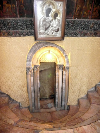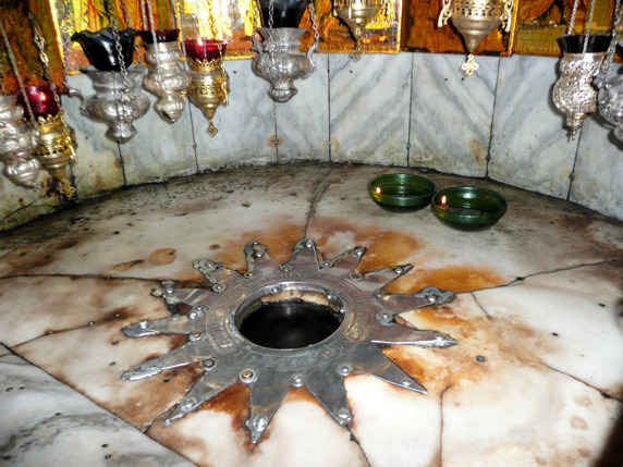 un agujero rodeado de una estrella de plata de 14 puntas señala el punto exacto del nacimiento de Jesús. En otro rincón de la cueva, bajando tres escalones, está la