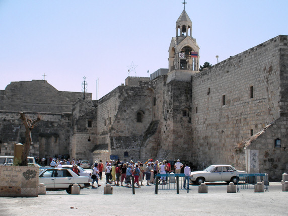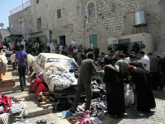 El bus nos deja en la carretera que lleva a Hebrón, desde donde hay que subir la colina atravesando un típico mercado árabe, pequeño y agradable. Aquí solo se venden artículos de consumo local: ropa, alfombras, artículos para el hogar, carnes, frutas, verduras. Nada de relicarios o botellas de agua bendita. Es sábado, esta a rebosar y más gente no cabe, pero no nos cruzamos con ningún turista. Solo en Manger Square, frente a la Iglesia de la Natividad, vemos un par de autocares.