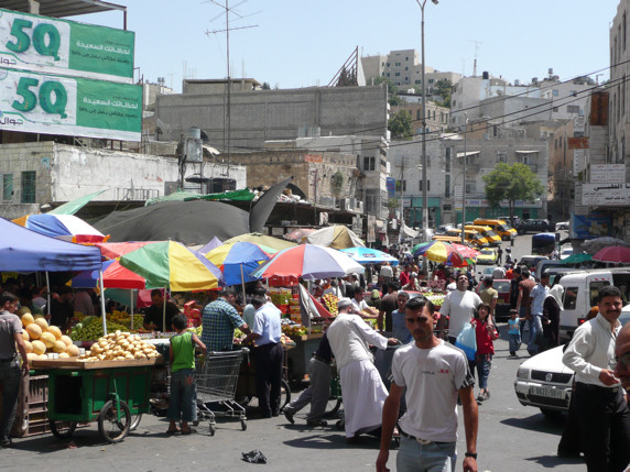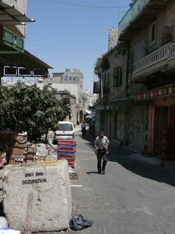 Nos apeamos en medio del nuevo mercado. Se trata de un mercado descubierto muy animado lleno de productos de todo tipo, surgido como consecuencia del desplazamiento de los negocios del viejo zoco, en la actualidad fuertemente vigilado por el ejército israelí Atravesándolo llegamos a una calle estrecha y desierta con pinta de no vivir nadie. Al fondo se ven lonas caquis y alambradas. Sin duda nos estamos acercando a la zona custodiada por los israelís. Un soldado desde una torreta y con un M16 en las manos nos pregunta por nuestra procedencia y hacia donde nos dirigimos, además de avisarnos de la prohibición de hacer fotos en esta zona. Entre tanto una