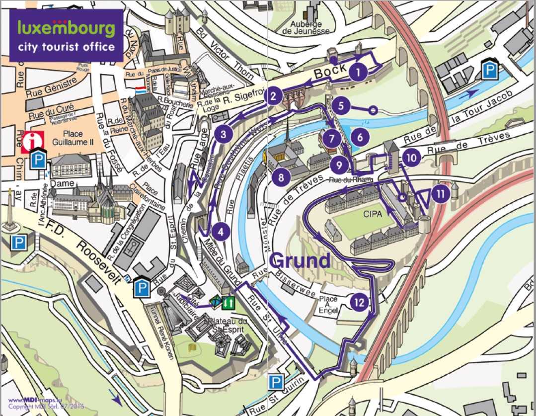 Grund es la ciudad baja, antiguo lugar de residencia de soldados y artesanos, es un barrio idilico a orillas del rio Alzette, tranquilo, abarrotado de cafes y restaurantes, ideal para pasear por sus calles adoquinadas semi peatonales. La manera mas fácil de recorrerlo es siguiendo el