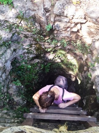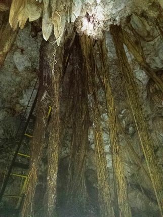 Chelentún, aquí la oscuridad es casi absoluta, es lo más parecido a una cueva con multitud de estalactitas. El agua está algo turbia y no nos bañamos. Lo más impresionante es el acceso, un estrecho agujero escondido entre el tronco de un árbol y sus raíces superficiales, se accede bajando por una escalera hecha con raíles de tren.