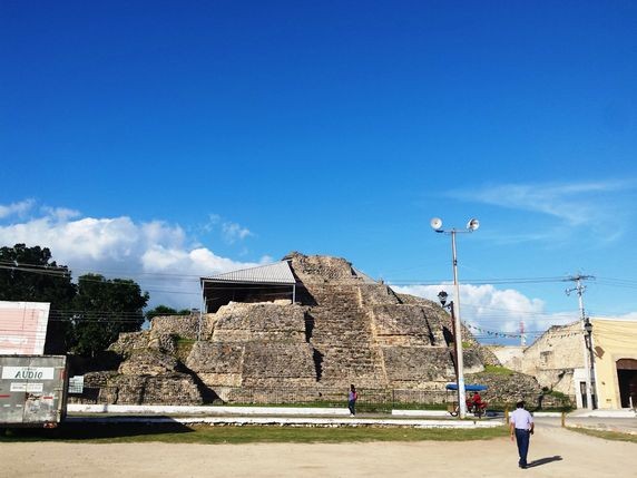 Acanceh. Su enorme plaza central alberga el Mercado Municipal; el Templo de Nuestra Señora de la Natividad, una iglesia colonial construida en el siglo XVI, en cuyo altar se venera a la virgen de Guadalupe; y los restos mayas conocidos como la Gran Pirámide y el Palacio de los estucos. En una esquina de la plaza hay un restaurante familiar muy sencillo, sin ningún rotulo que lo distinga. Pollo empanizado, sopa de frijoles, taco de res (carne de vaca con pimientos y cebolla), membrillo de papaya, jarra de jugo de limón y café, 150 MXN. La ruta sigue por