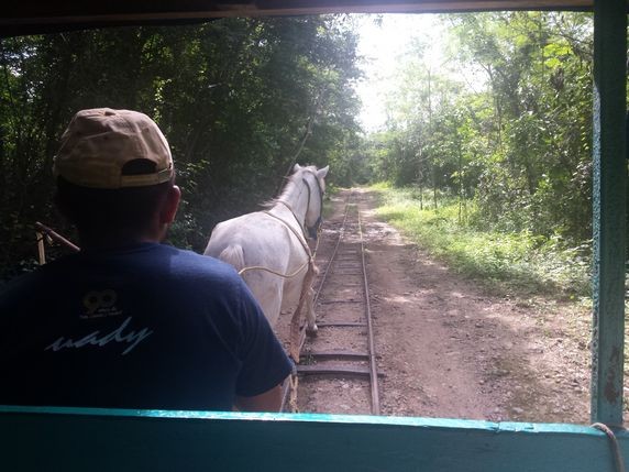 henequen, planta autóctona de Yucatán cuya fibra dura era usada para hilados en la industria textil (industria que entró en declive con la aparición de las fibras sintéticas), unos carros tirados por mulas con capacidad para cuatro pasajeros, avanzan durante siete kilómetros entre la maleza para llevarnos a tres cenotes distintos. La ruta cuesta 350 MXN y dura unas dos horas, en función de cuanto tiempo dure el baño en cada uno de ellos. El primero es
