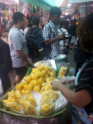 Tomamos un tuktuk a Siam Square, el centro comercial y económico de la ciudad. Alrededor de la plaza, a un minuto de distancia entre ellos, hay cinco enormes centros comerciales: Siam Discovery, Siam Center, Siam Paragon, Siam Square y MBK. Nosotros visitamos este último, el más grande de todos creo, un moderno bazar cubierto, lleno de pequeñas tiendas de todo tipo: zapatos, ropa y complementos, móviles y accesorios, muebles, supermercado, además de un gran cineplex multi-pantalla, rodeado de varios restaurantes y una bolera. En una de sus puertas está montado el Durian Festival de Bangkok, una ocasión ideal para probar esta curiosa fruta asiática, que combina un delicioso y cremoso sabor, con un olor apestoso que desanima a mucha gente con ganas de probarla. Tan fuerte es el olor que en la mayoría de hoteles está prohibido su consumo.
