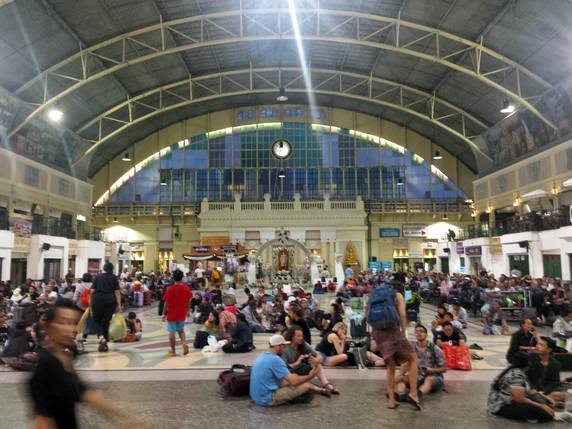 Hua Lamphong Railway Station es la principal estación de Bangkok. Salen trenes a casi todos los puntos del país. Tras la puerta principal las taquillas quedan a la izquierda, hay unas treinta y se supone qué en dos de ellas, al menos, hablan inglés. A su derecha quedan varias salas de espera con sillas donde sentarse. El resto son tiendas y puestos de alimentación, que rodean un enorme hall. Tras las taquillas están las vías, doce andenes creo recordar. Es un espacio grande, con mucha gente, pero no es difícil orientarse.