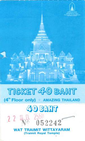 acceso al Golden Buda 40 bahts, acceso museo 100 bahts). Lo más llamativo de este templo es una imagen de Buda de oro de tres metros de altura y más de cinco toneladas de peso, considerada la mayor estatua de oro macizo del mundo. Fue elaborada durante el siglo XIII y en algún momento fue cubierta de yeso, probablemente para protegerla de los saqueos birmanos. No fue hasta 1955 cuando durante el traslado a su actual ubicación, las cuerdas se rompieron dejando caer la estatua, parte del yeso se desprendió y quedó al descubierto el metal precioso. Un hecho afortunado para este templo, que de otra forma pasaría desapercibido en el