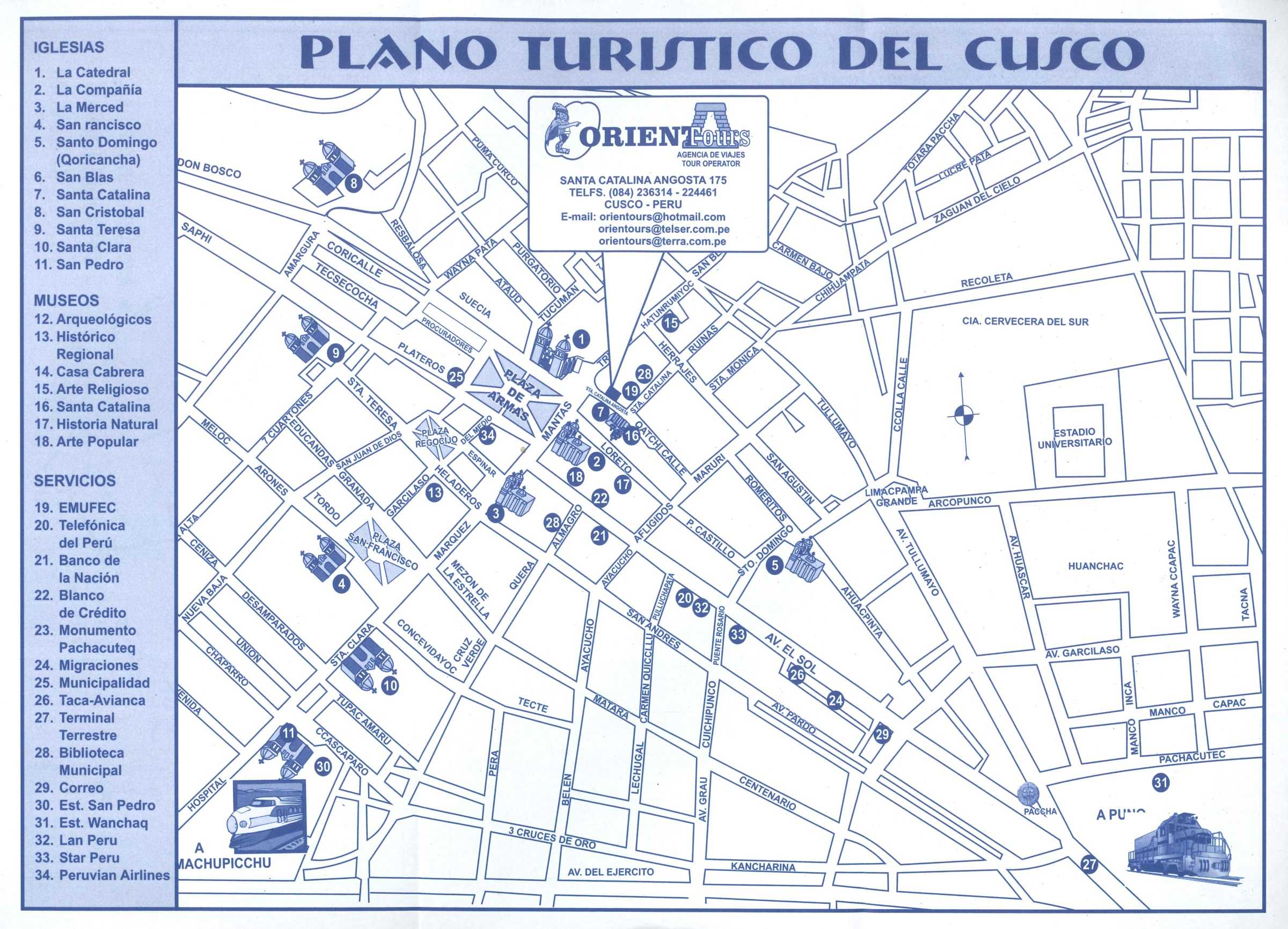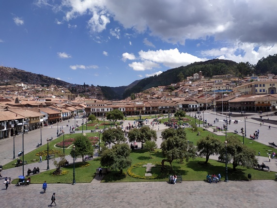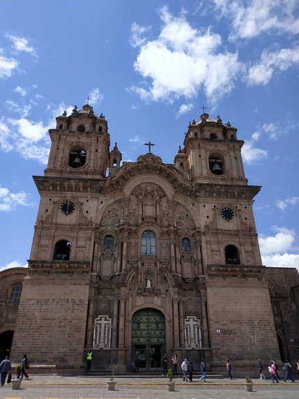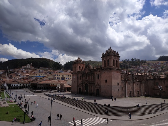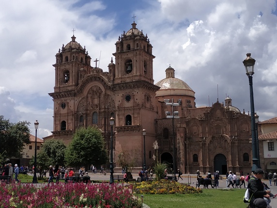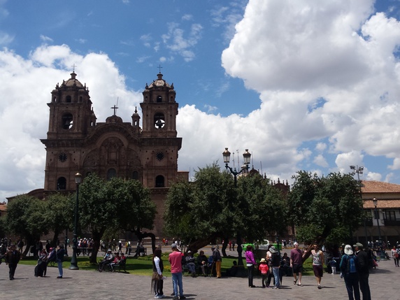 Plaza de Armas. Durante el incanato funcionó como lugar ceremonial donde se llevaba a cabo anualmente el Inti Raymi (fiesta del sol). Luego fue el lugar donde Francisco Pizarro proclamó la conquista del Cusco. Es sin duda la plaza más impresionante de Perú, nunca te cansas de ella. Toda ella está rodeada de arcos de piedra, casas de la época colonial, e iglesias. Un largo tramo de escaleras comunica la plaza con la Catedral. De estilo renacentista, fue construida sobre las ruinas del antiguo Templo de Suntur Wasi. Está flanqueada por la Iglesia de Jesus Maria y la Capilla del Triunfo, construida sobre el palacio del inca Winacacha. Entre los tesoros que guarda está una importante colección de lienzos de la escuela cusqueña y objetos de plata repujada. La Iglesia de la Compañía de Jesus, construida sobre el palacio de Huayna Capac en 1571, se encuentra en otro lado de la plaza.