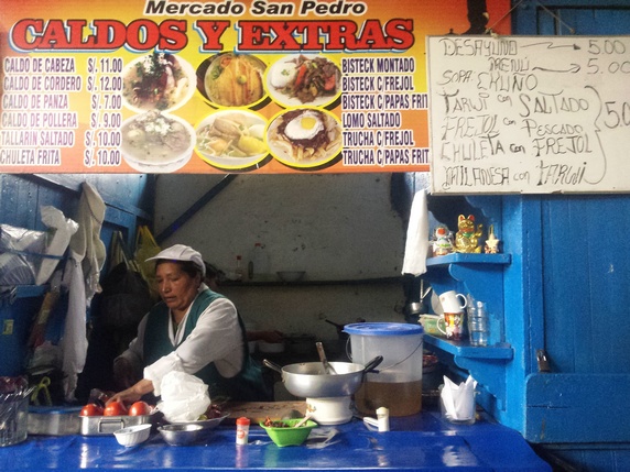 Comemos en uno de los muchos puestos de comida que alberga: una contundente sopa criolla de pollo (7 soles) y de postre churro de manjar o dulce de leche, (2 soles)