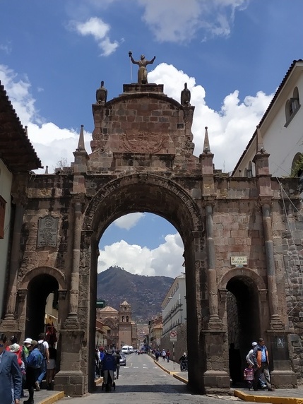 Seguimos hasta la plaza San Francisco, una enorme plaza con una fuente rodeada de árboles y jardines, que antiguamente formó parte de la explanada inca de Cusipata, el segundo espacio público más importante de la ciudad durante el período virreinal. Pasamos bajo el Arco de Santa Clara, construido en 1835 para conmemorar la confederación de Perú y Bolivia. Al fondo se ve la iglesia de Santa Clara, un convento de cal y piedra con una sola torre campanario, fundado en 1549 por las clarisas, la rama femenina de los franciscanos.