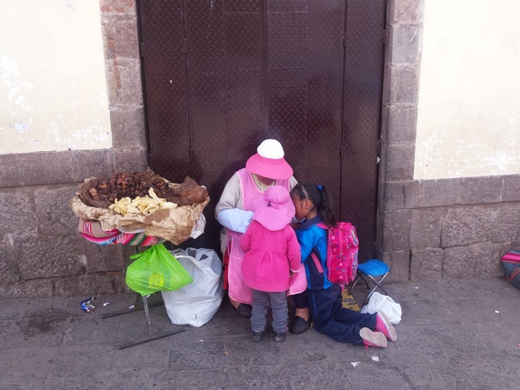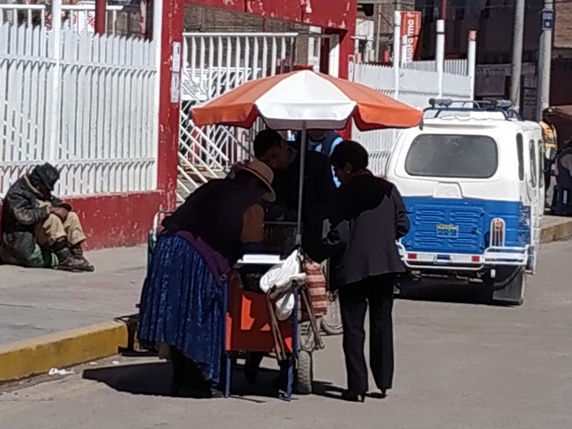En los alrededores de la estación compramos algo para comer. A las 12h, hora de salida, con el autobús cargado de bultos y pasajeros, nos hacen desembarcar y cambiar de vehículo porque han detectado alguna anomalía en una de las ruedas. Salimos media hora tarde en otro vehículo. Al llegar a Juliaca hay una nueva avería, esta vez en el motor. Como la compañía no dispone de más autobuses, nos ubican en uno de la compañía Continental. Los asientos aquí no son tan cómodos, de hecho son de categoría inferior a la que hemos pagado, pero si quieres llegar hoy a Cuzco es lo que hay. Durante el camino suben vendedores de frutas, zumos, e incluso cordero; siempre es mejor llevar algo, sobre todo agua, pero es difícil morir de hambre. El trayecto acaba durando nueve horas, llegamos reventados.