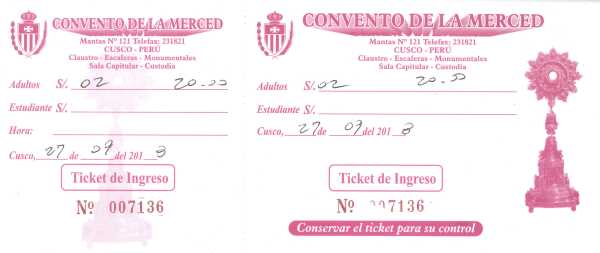 acceso 10 soles. En 1535 los mercedarios llegan al Cuzco, y en seguida gozan del favor de Pizarro quien les cede un solar en premio a los servicios prestados. Las primeras construcciones son destruidas casi por completo en el terremoto de 1650, y no es hasta 1671 que tiene su aspecto actual. En su interior se encuentran los restos del hermano del conquistador Pizarro, así como una extensa pinacoteca que se exhibe en las paredes del claustro principal, pero la pieza más valiosa de su colección es una custodia de oro de 1,30 mts de altura, adornada con piedras preciosas y coronada por lo que es considerada la “segunda perla más grande del mundo”.