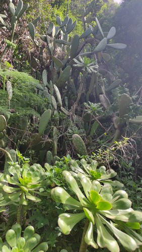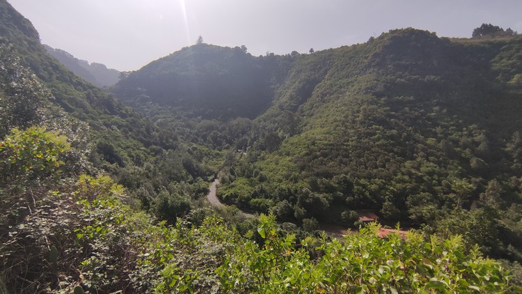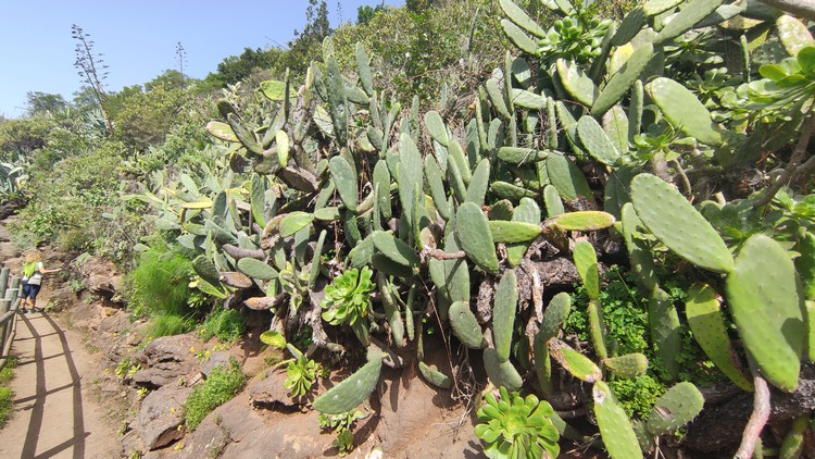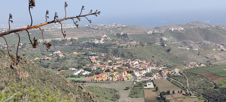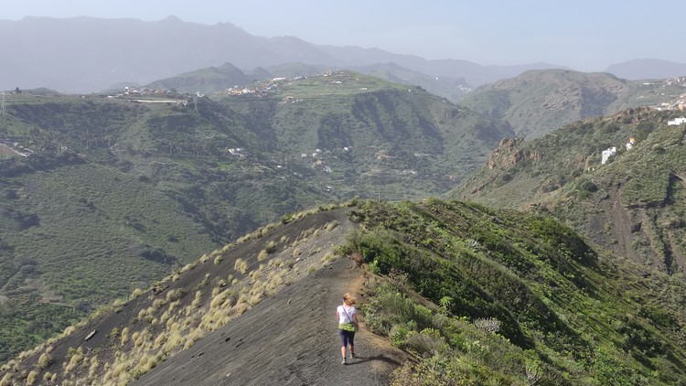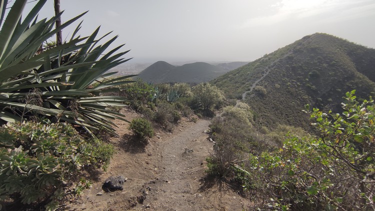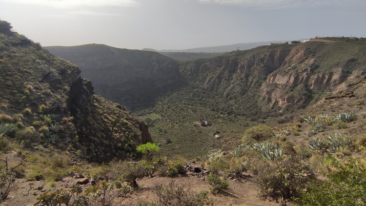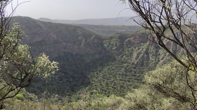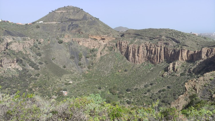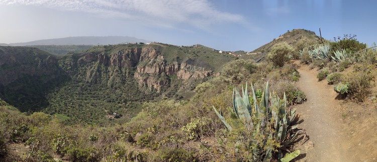 Sendero Caldera de Bandama se encuentra en un espacio de gran riqueza natural que se formó hace cinco mil millones de años junto al antiguo volcán Pico de Bandama. La caldera tiene 216 metros de profundidad, 574 metros de altura y mil metros de diámetro. Es una camino muy interesante que recorre todo el perfil del volcán, una ruta corta de apenas 3 km que no es de gran dificultad, aunque el sendero tiene desniveles pronunciados, tanto de subida como de bajada, en los que se camina sobre un terreno inestable, por lo que los resbalones son frecuentes. Además, tiene una zona poco recomendable para personas con vértigo, puesto que un tramo discurre entre la caldera y el barranco que se sitúa hacia el sur, con pendientes casi verticales a cada lado. El día que lo hicimos corría un fuerte viente y en este tramo hacia un poco de yuyu. Al principio de la ruta hay un mirador desde el que se ve toda la caldera, así como las poblaciones cercanas y Las Palmas al fondo.
