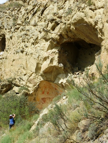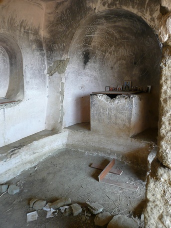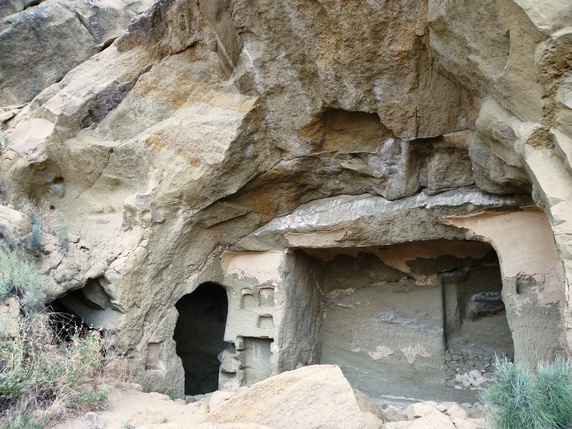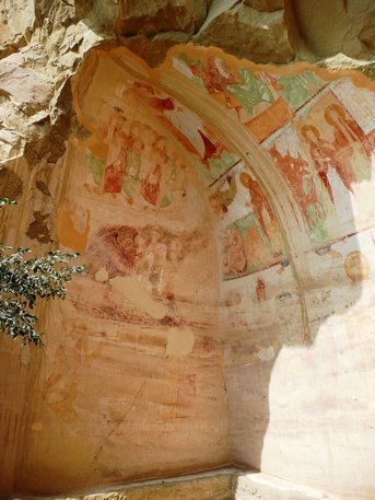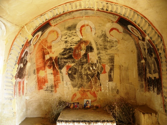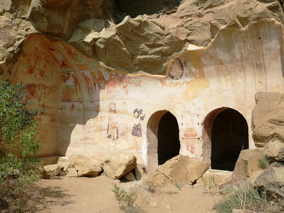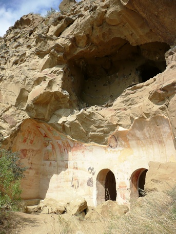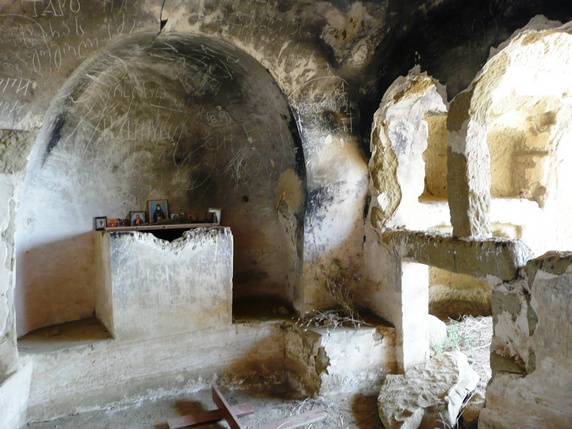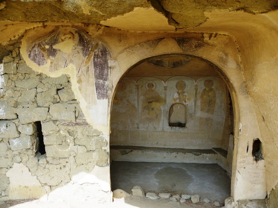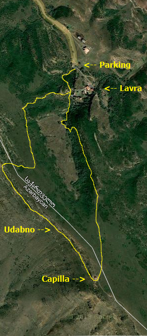 Ahora hay que girar a la izquierda y seguir el camino que transcurre paralelo a un pequeño despeñadero de unos trescientos metros que acaba en tierras de Azerbaiyán. Iremos encontrándonos con una sucesión de cuevas, estancias y pequeñas capillas, algunas de ellas decoradas con frescos que datan entre los siglos IX y XIV. Seguir hasta una pequeña capilla en la cima de la montaña donde se inicia la vuelta al punto de partida. Durante el descenso vemos algunas cuevas con escalones tallados para acceder a ellas, y algunas a las que llegan estrechos surcos diagonales creados para recoger el agua en cascada por la losa.