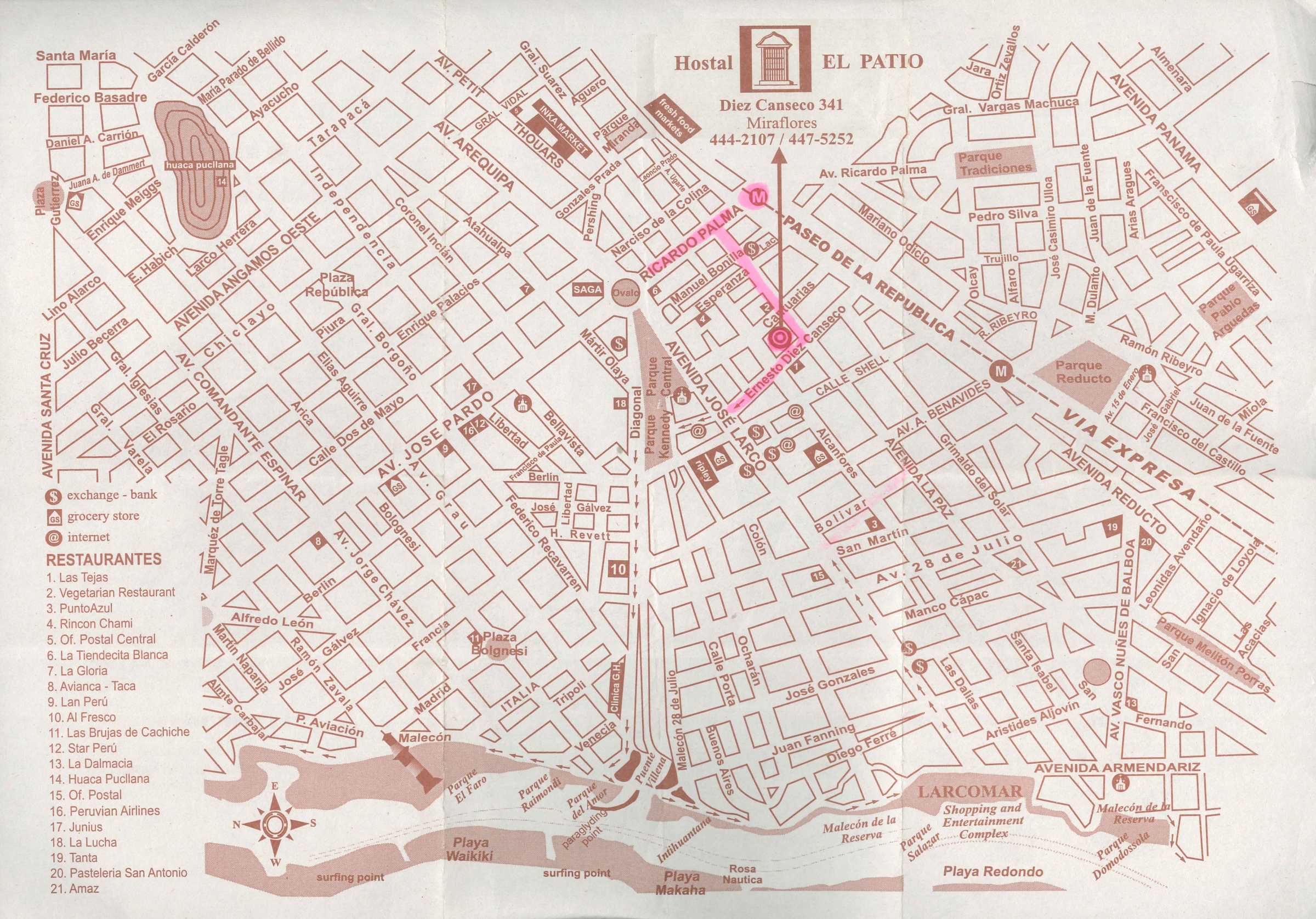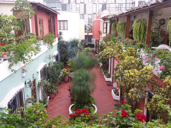Hostal el Patio, 180 soles. Bien situado, cerca del centro de Miraflores. Habitación doble con baño privado, amplia y limpia. Parece una antigua casa colonial con un pequeño patio interior, tranquilo y bien decorado. Desayuno incluido (fruta variada, picadillo de aceituna verde, huevos, café, infusiones de té y coca, pan, mantequilla y mermelada). El