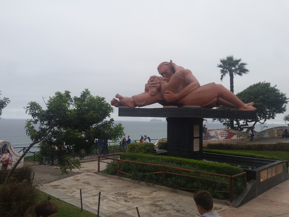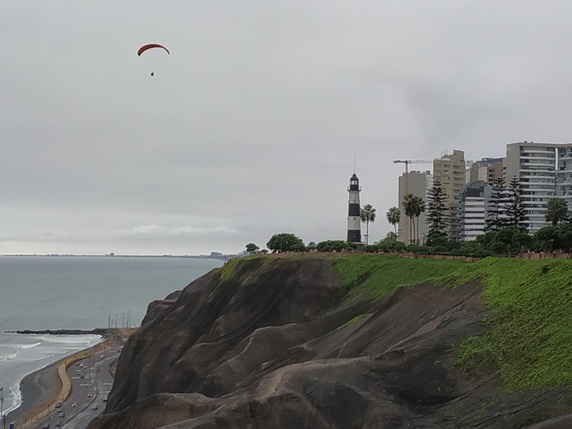 malecón, bordeado de acantilados de 200 – 300 mts de altura, parques y miradores con vistas al Pacífico. Empezamos en Larcomar, un centro comercial a varios niveles, con agradables terrazas y restaurantes frente al océano, y un montón de tiendas donde fundir la tarjeta. Después viene el puente de Villena Rey y el Parque del Amor (una zona ajardinada con una enorme escultura conocida como El Beso), el Parque Raimondi, una zona usada como punto de lanzamiento para parapentes, y por último, el Faro.