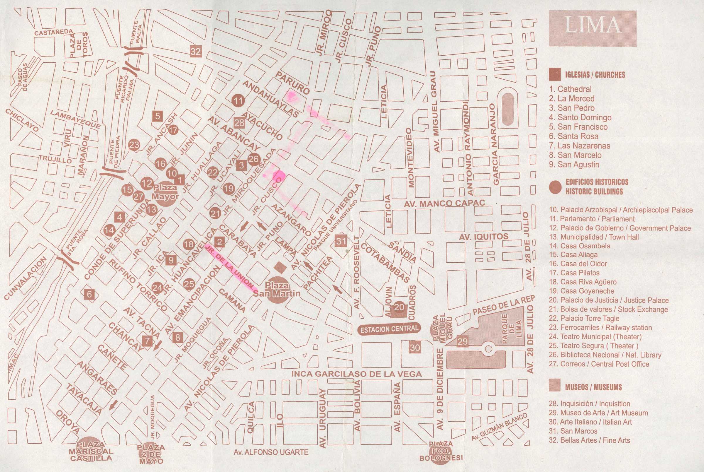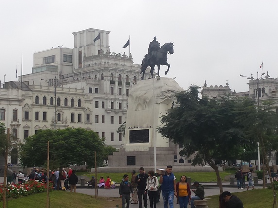Plaza San Martin, fue inaugurada en 1921 para festejar el centenario de la independencia del país. En la parte central hay un monumento en honor al libertador Jose San Martin. Está rodeada por bonitos edificios de estilo neocolonial, entre los que destacan el Gran Hotel Bolívar y el teatro Colon. En la calle Jirón Ocaña, la calle que hace esquina con el hotel, hay mucha gente cambiando moneda en la calle, estilo los arbolitos argentinos. Las dos plazas están unidas por Jirón de la Unión, una calle peatonal de casi 1 km de largo flanqueada por establecimientos comerciales, restaurantes y casas coloniales. En esta calle llama la atención la recargada ornamentación de estilo barroco churrigueresco de la fachada de la Basílica de la Merced.