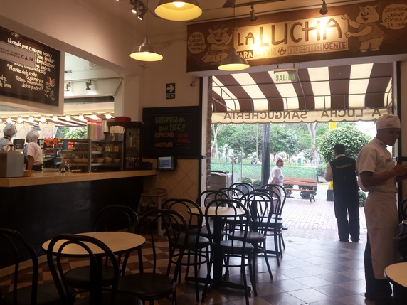 Sangucheria La Lucha. Es una cadena especializada en sándwiches de carne horneados en leña y zumos naturales, que tiene varias sucursales distribuidas por todo el país. Sin duda los mejores bocadillos que probaras en Perú. La carne es suave, tierna y sabrosa, todo el surtido de salsas tiene muy buena pinta, el pan es tierno y crujiente, y las raciones razonables. Pedimos uno de bistec y queso, otro de chicharrones, y dos tés, 45 soles.