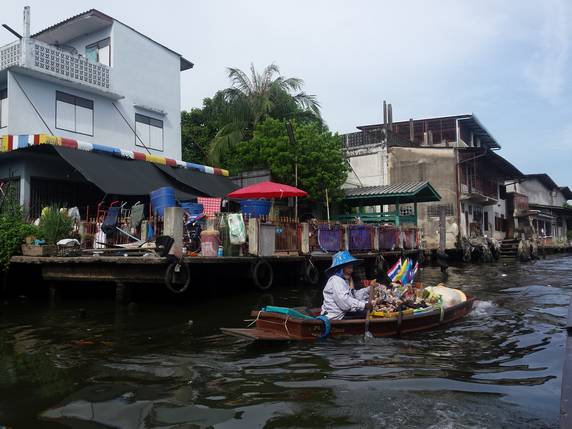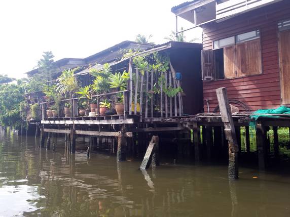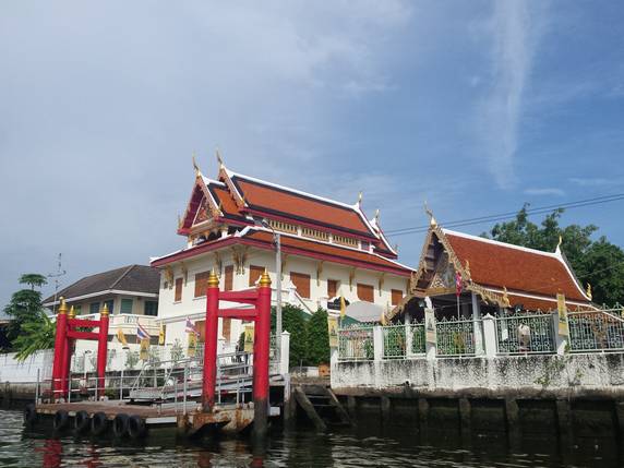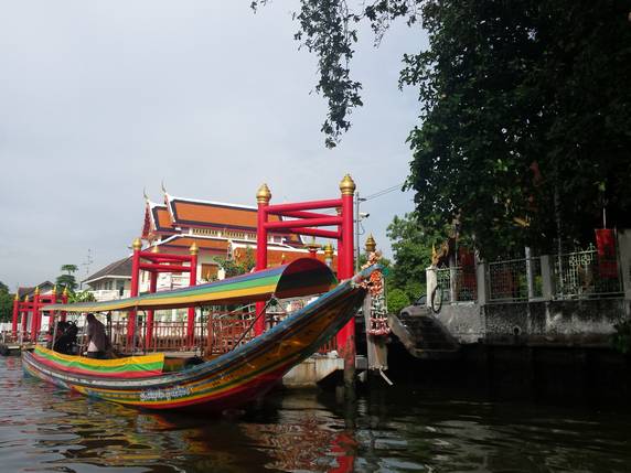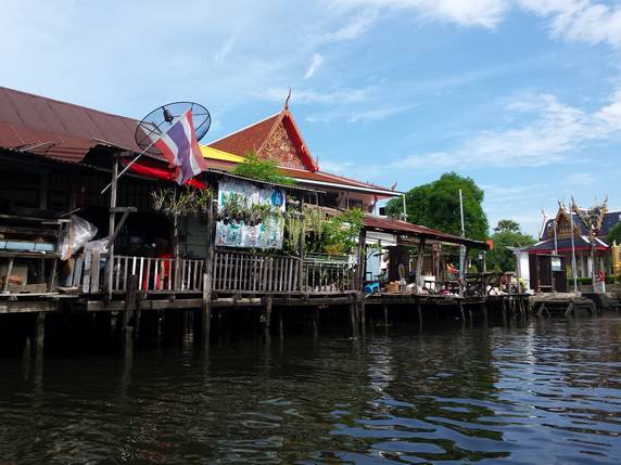 Paseo por los canales, 100 bahts cada uno. La gran timada de "no vayas al templo que hay una ceremonia y no abre hasta las once". Mira que lo sabíamos, íbamos avisados, pero aun así y todo caímos. De repente, no sé cómo, estábamos metidos en una barcaza dando vueltas por los canales del río Chao Phraya, realizando un recorrido en las proximidades del Palacio Real. Alrededor de una hora viendo las diferentes caras de Bangkok, barrios pobres, barrios muy pobres, algunas casas acomodadas, más de treinta templos de todos los tamaños, varanos, garzas, suciedad... Era una barca de doce plazas, que, seguro que pagamos entera, pero que por suerte, siendo un país barato como es Tailandia, recordaremos como algo anecdótico.