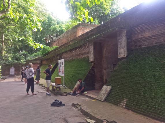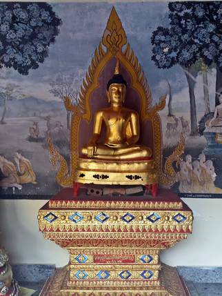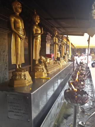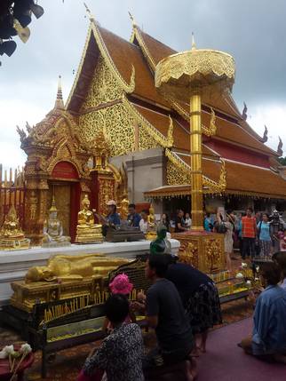 chedi dorado rodeado de muros decorados con estatuas de Buda y murales explicando las vidas anteriores de Buda. Decenas de fieles dan vueltas alrededor de él. Rodeando el