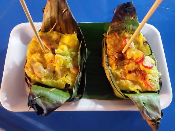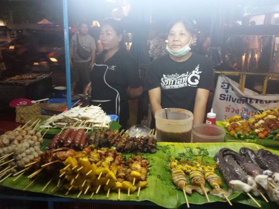 A ambos lados de la calle hay puestos de refrescos, fruta fresca y brochetas, y los patios de los templos se convierten en zonas de restauración con mesas y sillas, donde se vende de todo: arroz, pescado fresco, carne e incluso grillos fritos.