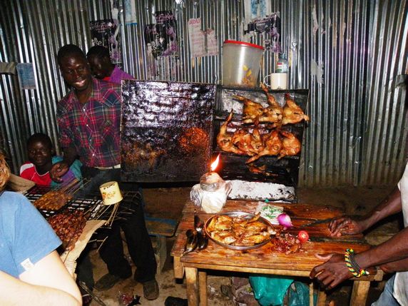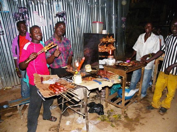 Por la noche el centro de Kampala se llena de barbacoas: brochetas de ternera (500 shs), de pollo (2.000 shs un cuarto), chapatti (200 shs), hígados de pollo... |