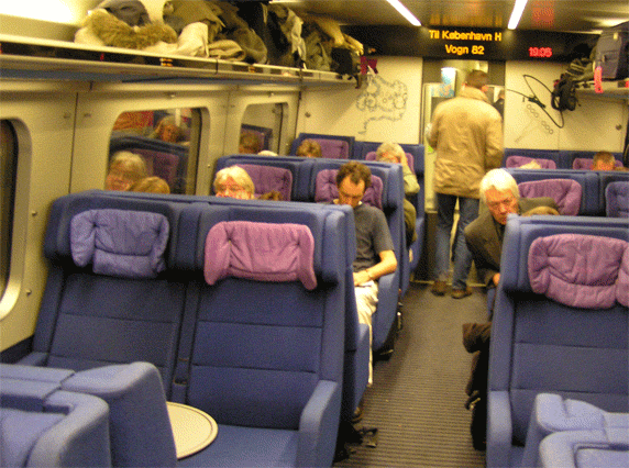 EC 37. 17:28 Hamburgo 21:59 Copenhague. Reserva: 3€. Tren de tan solo tres vagones, uno de ellos de fumadores. El tren va haciendo paradas y al llegar a Puttgarden, el tren se introduce en la bodega de un ferry, con los camiones, para cruzarnos hasta Faerge, en la costa danesa. El trayecto dura 45 minutos y se puede salir a pasear por cubierta. La mayoría de la gente aprovecha para ir al supermercado a comprar alcohol y productos duty free.