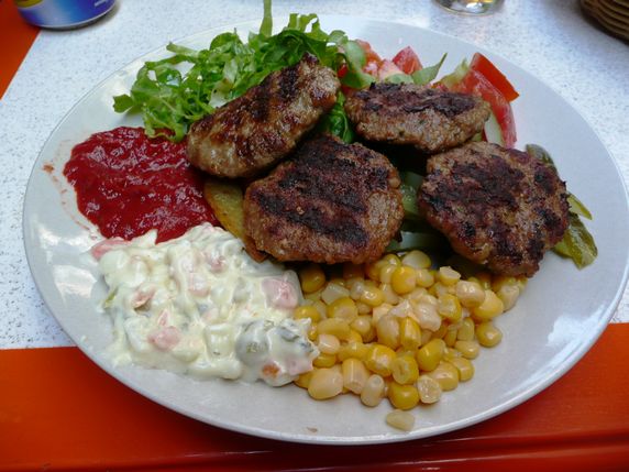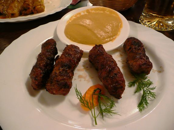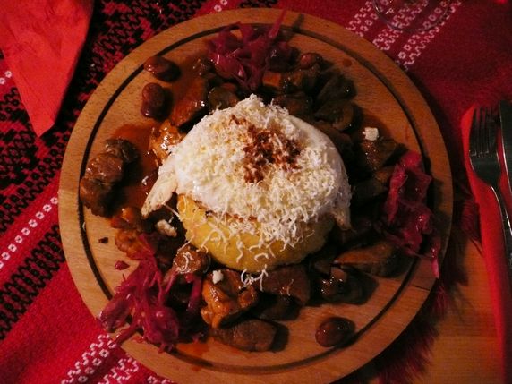 ciorba de legume (de verduras). También es muy típico el sarmale, una mezcla de carne de cerdo picada, arroz, cebolla y tomate, envuelta en una hoja de col o repollo (sarma significa "enrollado"). En el plato de la foto vienen acompañados de smântână (nata pasteurizada) y mamaliga, una especie de pan de color amarillento elaborado con harina de maíz, muy popular como acompañamiento. La siguiente foto corresponde a tochitura, un estofado de carne con legumbres, cebolla, hígado y/o riñón de cerdo, y especias. Por ultimo mititei, otro de los típicos. Se trata de carne de cordero o cerdo picada, con ajo, pimienta negra molida, y algunas hierbas, todo ello amasado y en forma de rollo que se asa a la parrilla.