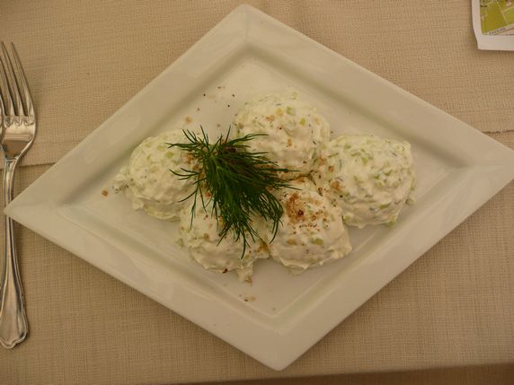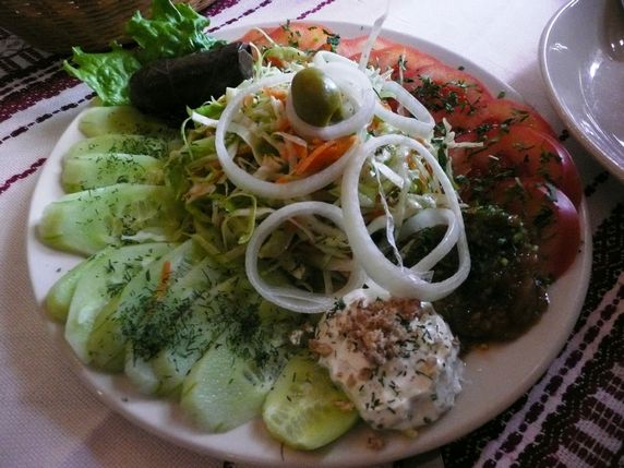 Dos ensaladas probamos, la Snezhanka (Blancanieves), una ensalada de yogurt, pepino, ajo y nueces; y la