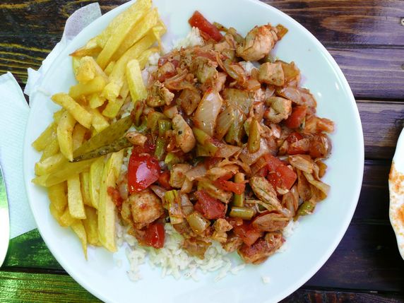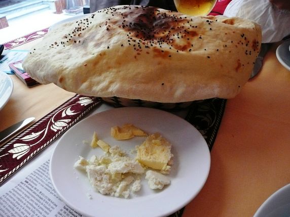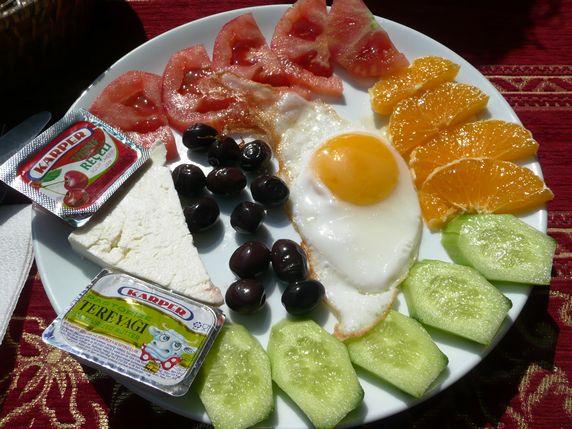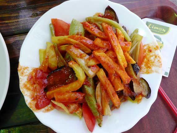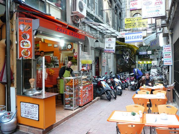 Estambul. El día en Estambul empieza con un kahvalti, el desayuno típico turco: olivas negras, pan turco, unas rodajas de tomate y pepino, y queso fresco, acompañado de un buen vaso de té. A mediodía un döner kebab (el plato más conocido del país). Se suele servir en un pan redondo y aplastado característico de la cocina árabe llamado "pan de pita", acompañado de ensalada, o en plato con patatas fritas. Otras opciones son pide, la pizza turca, un pan plano cortado en trocitos pero sin romper, que se prepara con diferentes ingredientes: carne picada, queso, cecina etc. Kofte, se trata de unas bolas elaboradas con carne picada de vaca o de cordero que se suele mezclar con diferentes especias y a veces también con cebollas picadas. La carne se suele mezclar en algunas ocasiones con arroz, burghul, verduras, o huevo para formar una pasta que luego se asa. Las sopas más conocidas son ezo gelin, de lentejas y menta, y domates, de tomate. De postre, evidentemente, baklava un pastel elaborado con nueces, pistachos, sémola u otros granos, distribuidos sobre la pasta filo y bañado en almíbar o miel.