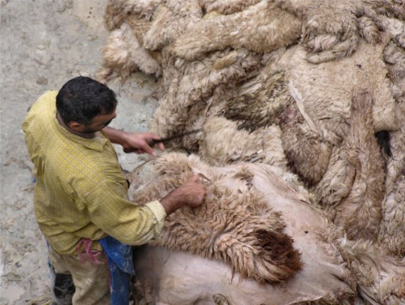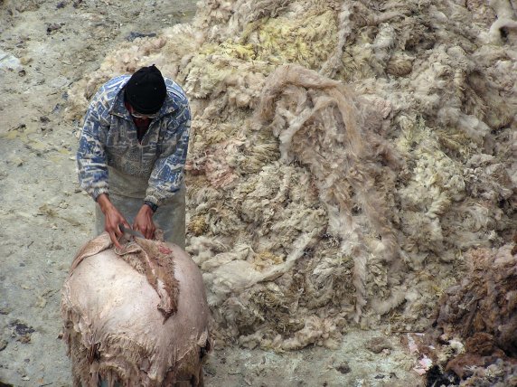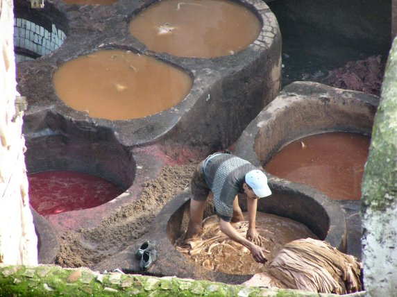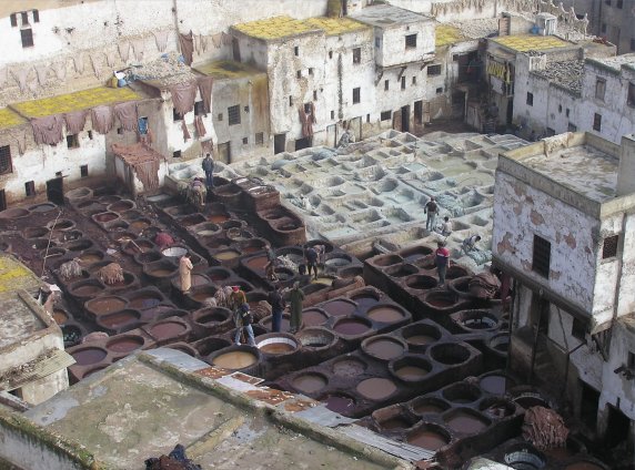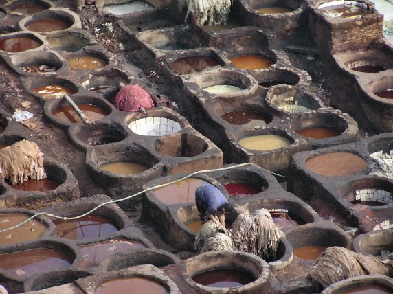 curtidurías, visibles desde algunos tejados, donde se aprecian pieles dejadas secar al sol, asistimos a uno de los trabajos más duros de Marruecos. Su fuerte olor a pieles de animales, orina de vaca (mezclado con el tinte para su conservación) y sudor humano, hacen de la visita una experiencia inigualable. Cisternas de un metro cuadrado, adosadas unas a las otras, albergan hombres que se bañan hasta medio cuerpo para poder empapar y dar la vuelta a las pesadas pieles.