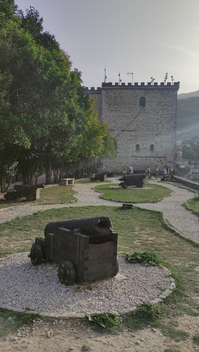 El castillo de Gjirokastër (400 lek) ubicado sobre una colina 200 mts sobre el Drino Valley, con unas vistas espectaculares del valle y las montañas circundantes, es el segundo más grande de los Balcanes. Las primeras fortificaciones se remontan al siglo XIII, aunque entre finales del XIV y el siglo XIX, bajo la ocupación otomana, se realizan las mayores mejoras y ampliaciones. Alberga el Museo de Armamento (200 lek) que contiene una extensa colección de armas de época, fotografías y obras de arte, y un par de tekkes, mezquitas sufíes. Debajo del castillo se encuentra un búnker subterráneo construido durante la Guerra Fría.