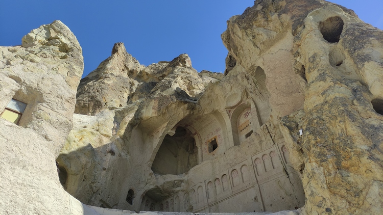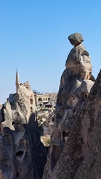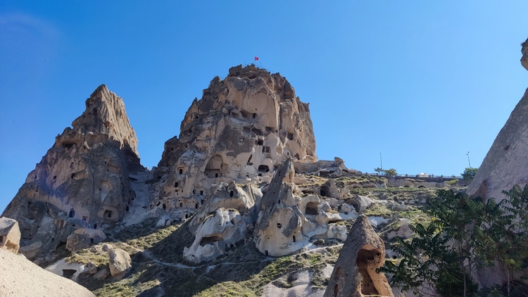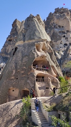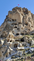 castillo de Uchisar. Aprovechando una enorme formación rocosa de 100 mts de altura, surgida de la erupción del volcán Erciyes, se moldeo excavando decenas de viviendas, iglesias, escaleras y pasadizos que le dan al conjunto un aspecto de fortaleza. En los períodos persa y seleúcida, se utilizó como centro de control de comercio en la Ruta de la Seda.