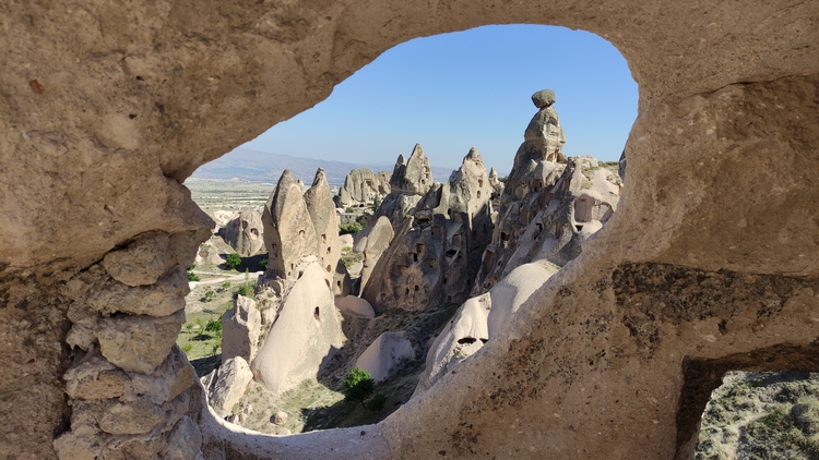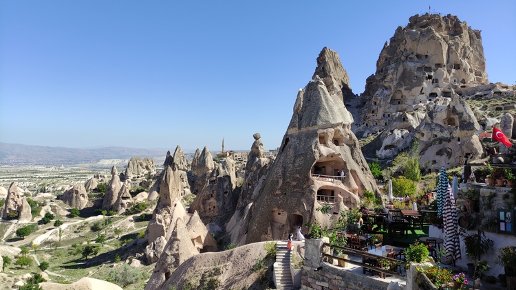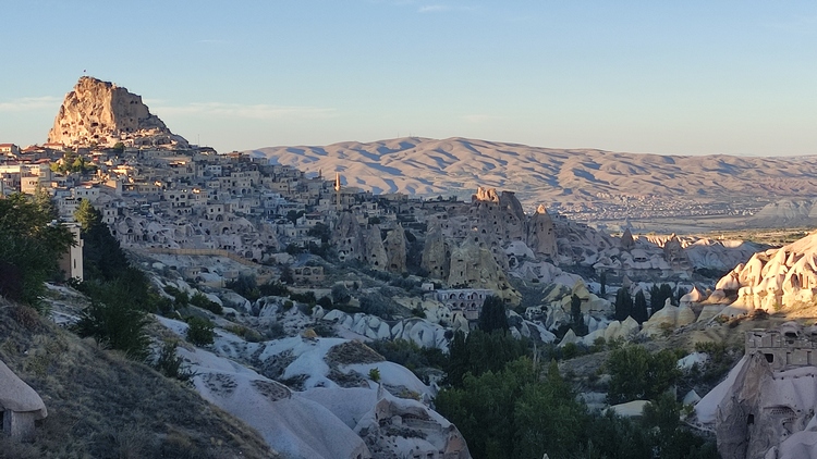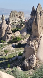 Cerca de Uchisar paramos para tener una visión panorámica del Pigeon valley. Desde una colina se ven cientos de palomares tallados en las laderas de la montaña para facilitar la anidación de palomas. Estos animales se utilizaban como mensajeras, para comer los huevos, e incluso para aprovechar los excrementos como abono natural.