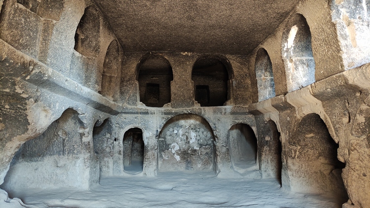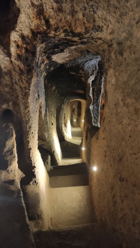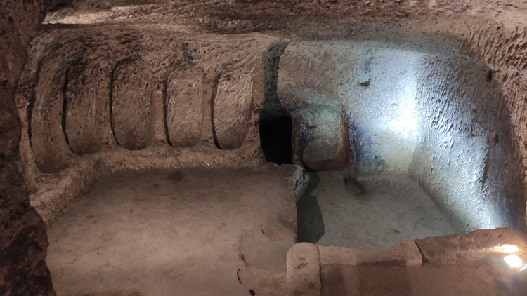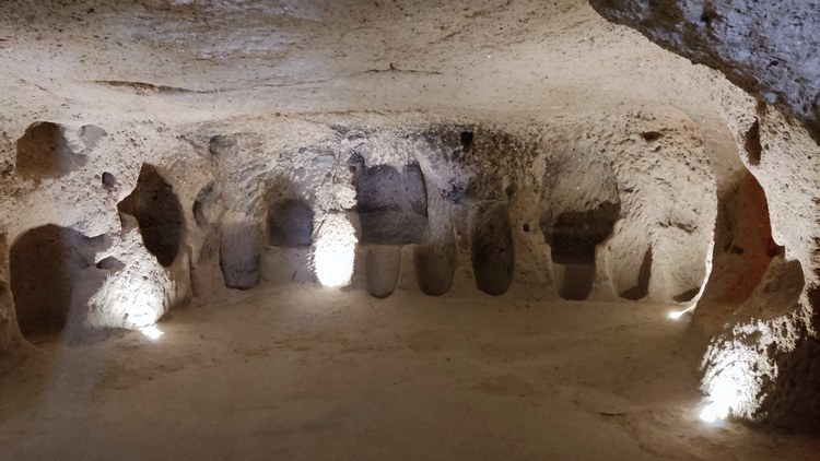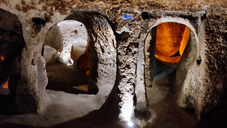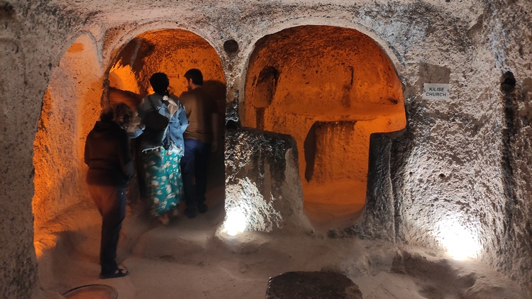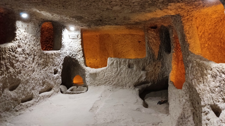 Derinkuyu Yeralti Sehri. Aprovechando la piedra volcánica blanda de la zona, los locales excavaron una ciudad subterránea, con hasta ocho niveles de profundidad, como refugio y escondite contra las incursiones árabes. Se trata de la ciudad subterránea más grande de Turquía, alcanza los 85 metros de profundidad y podía albergar hasta 20.000 personas y su ganado. Habitaciones, cocinas, prensas de vino y aceite, establos, bodegas, salas de almacenamiento, refectorios y capillas, todo ello conectado por estrechos túneles. Una autentica proeza de la ingeniería de la época.