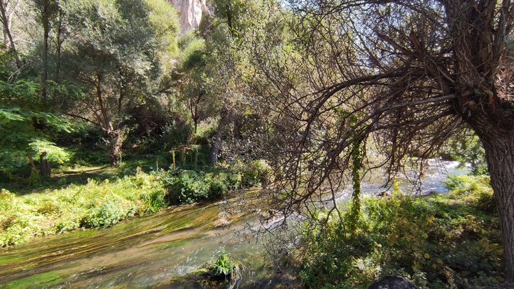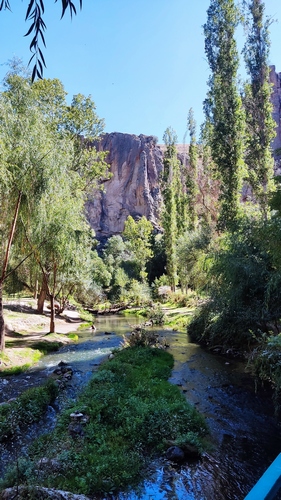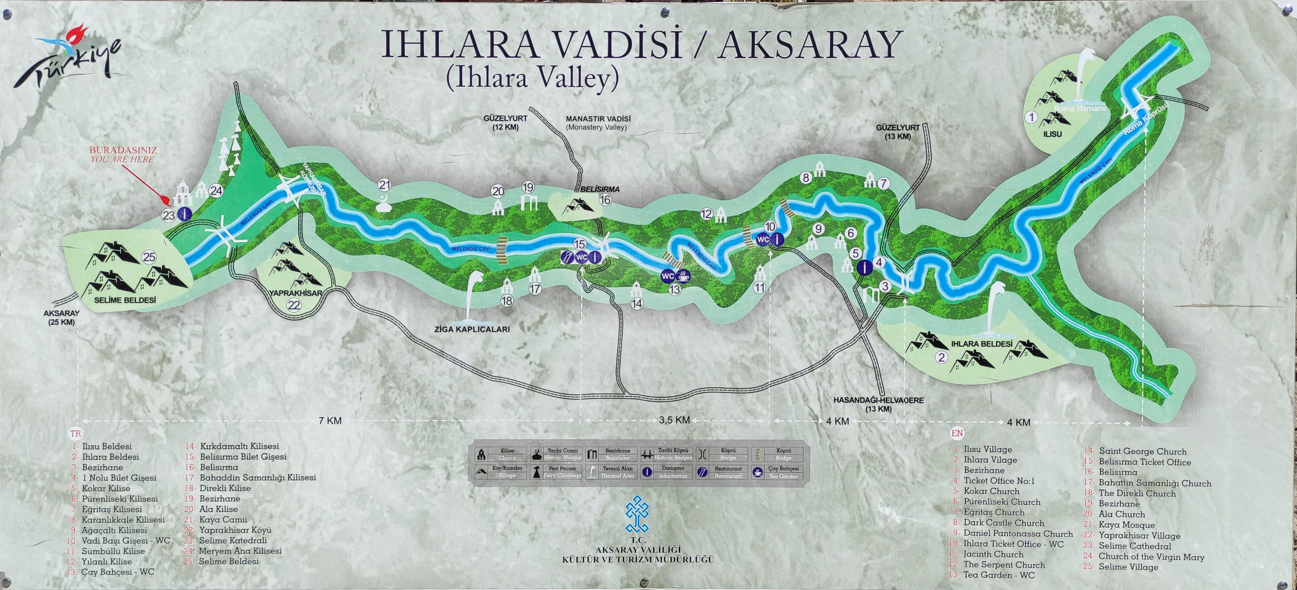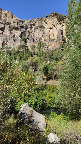 Ilhara valley, originado por la continua erosión durante millones de años del río Melendiz, que ha creado un cañón de 80 metros de profundidad y unos 15 km de largo. Es un paseo plano y cómodo de unos 3,5 km que transcurre paralelo al río. En las paredes del cañon pueden verse estancias excavadas en sus paredes, tan típicas de la región. Acabamos en