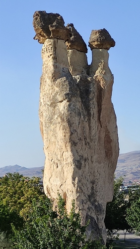 chimeneas de hadas, se crean cuando la toba se mezcla con roca, después la erosión desgasta la toba creando un cono sobre el que descansa la roca, y finalmente la parte inferior sucumbe por el peso, todo se derrumba y el proceso comienza de nuevo. Este proceso, que tarda cientos de años en producirse, ha creado extensos campos de chimeneas de hadas, en su mayoría en el triángulo que forman las poblaciones de Nevşehir, Avanos y Ürgüp, la zona más visitada de la región.