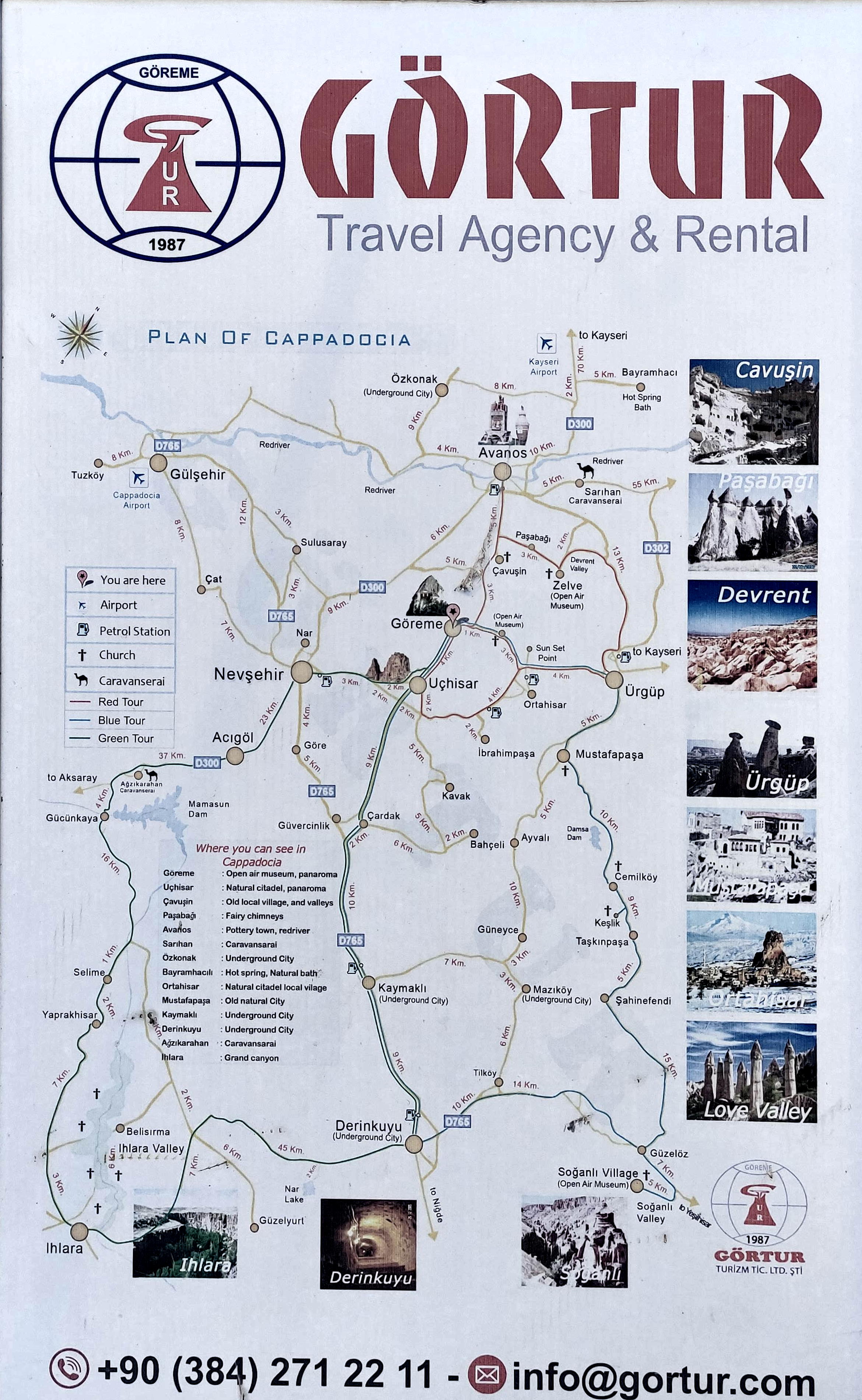 Pero aunque son las más visibles y evidentes, las chimeneas de roca no son la única atracción de la Capadocia. Hay atractivos suficientes para llenar varios días, ciudades subterráneas construidas por los hititas, iglesias y viviendas excavadas en roca, frondosos cañones, o los famosos paseos en globo. Aunque la región es relativamente pequeña, unos cincuenta kilómetros de diámetro, estos puntos están dispersos en el mapa y a la mayoría de ellos no llega el transporte público, así que no disponiendo de vehículo propio, lo mejor es contratar un tour directamente en el hotel o en alguna de las numerosas agencias de viaje. Todos ofrecen lo mismo. Dividen la zona en tres áreas diferentes a las que asignan los nombres de Green Tour, Red Tour y Blue Tour, siendo los dos primeros los más ofertados, algunas agencias ni trabajan con el Blue. Los tours son con conductor y guía, comienzan a las 08:00 y acaban alrededor de las 18:00.