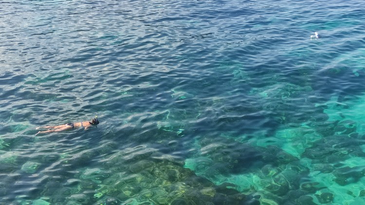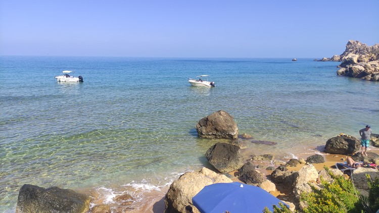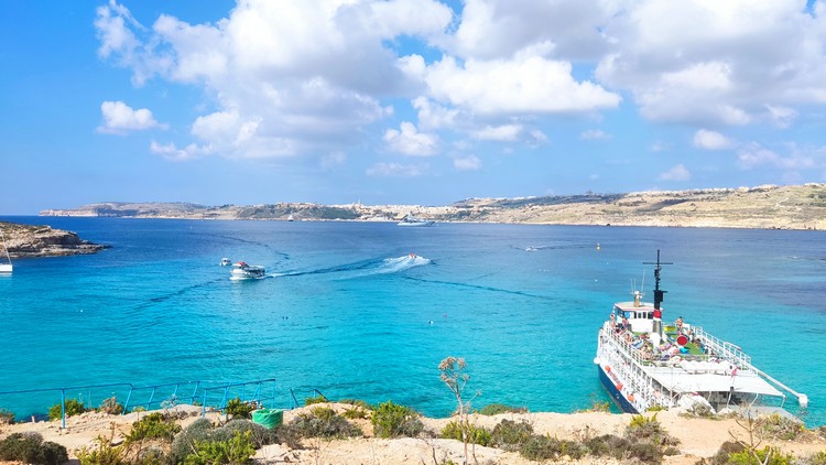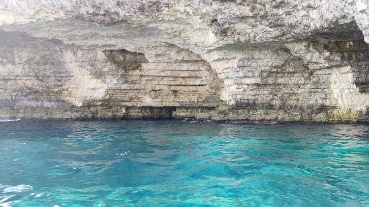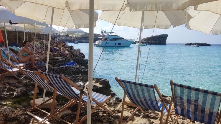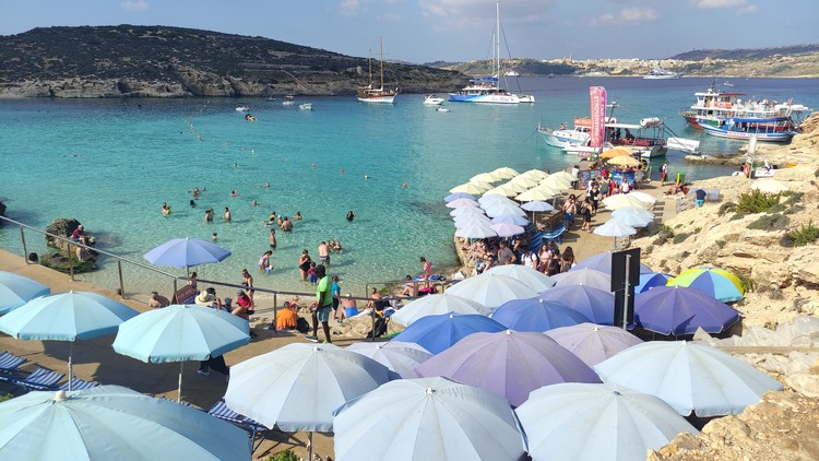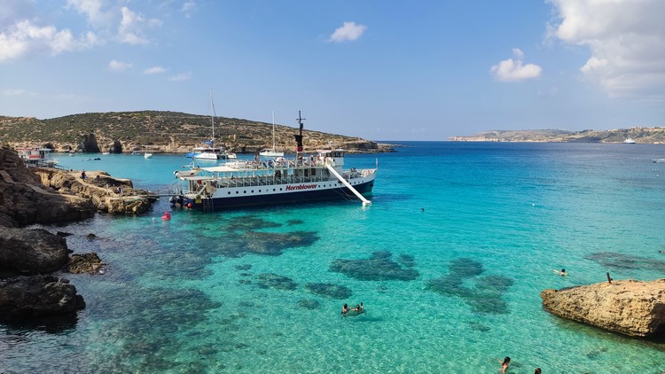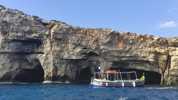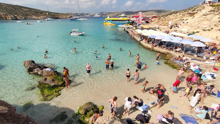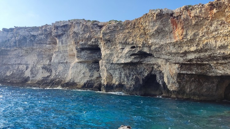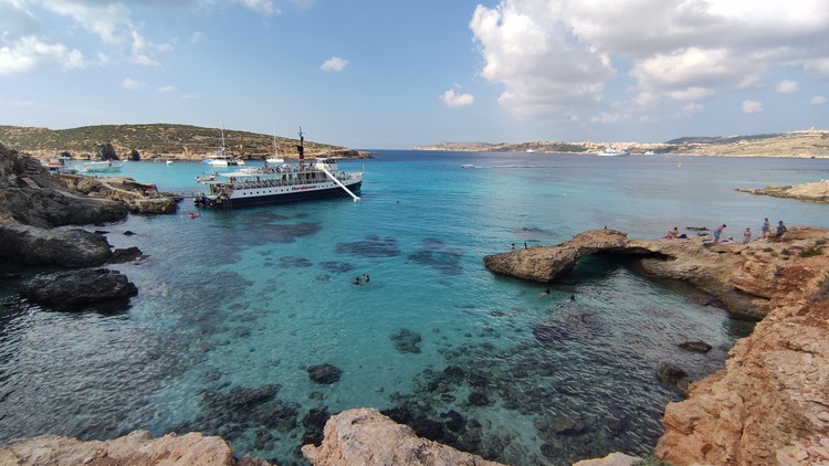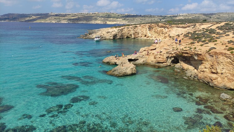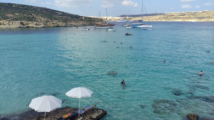 Blue Lagoon, en la isla de Comino. Es una estrecha playa de roca de aguas azules, transparentes y cristalinas, abarrotada de sombrillas, sin más espacio para los que no quieren pagar su alquiler, que algunas rocas donde dejar la ropa, estirarse imposible. A pesar de todo merece la pena el baño, más aún si cruzas a Cominito, la minúscula isla que hay enfrente, donde se puede llegar nadando en apenas cinco minutos. En su playa principal hay un gran fondo rocoso y muy buen snorkel. En el resto de la isla hay pequeñas calas con muy buenas opciones de snorkel, ya que todas son muy rocosas, aunque no siempre son de fácil acceso. Hemos visto varias morenas, peces rayas color marrón, verde y amarillo… Para llegar a Comino desde el muelle de il-Qala/Mgarr salen pequeñas lanchas para 6-8 personas que llevan hasta Comino. Cuesta 10€ el viaje de ida y vuelta, 15€ si incluye un paseo por las cuevas al otro lado de la isla Comino. La hora de vuelta se pacta con el patrón, pasa cada hora.