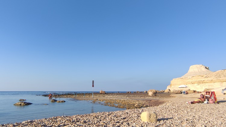 Dahlet Qorrot Beach es realmente una zona de baño, no una playa. No hay ni arena ni piedras ni nada, es un embarcadero frente a unas casetas de pescador horadadas en la roca de la montaña, donde se han colocado unas escaleras para acceder al mar. Impresionante fondo marino con una extensa pradera de posidonias que atrae mucha vida. Muy buena opción para snorkel. Hay un chiringuito donde venden bebidas y algunos tentempiés básicos.