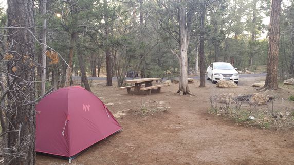 Mother Campground, 15$ tienda, ducha 2$ por 8 minutos. Un lugar idílico en medio de una inmensa y tranquila arboleda. Nuestra plaza es para 3 tiendas y dos coches, nunca hemos estado tan anchos. En el camping hay lavabos pero no duchas, que están a unos 10 minutos andando (1 minuto en coche). La conexión