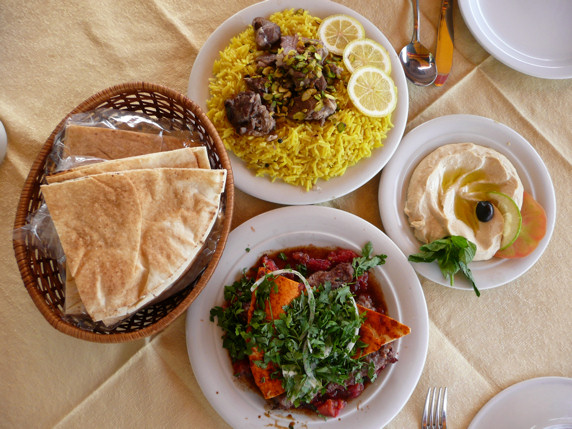 Rest. Four Norias. 410 SL kebab, arroz con cordero y humus, sentados en una terraza con vistas a las Cuatro Norias de Bechriyyat.