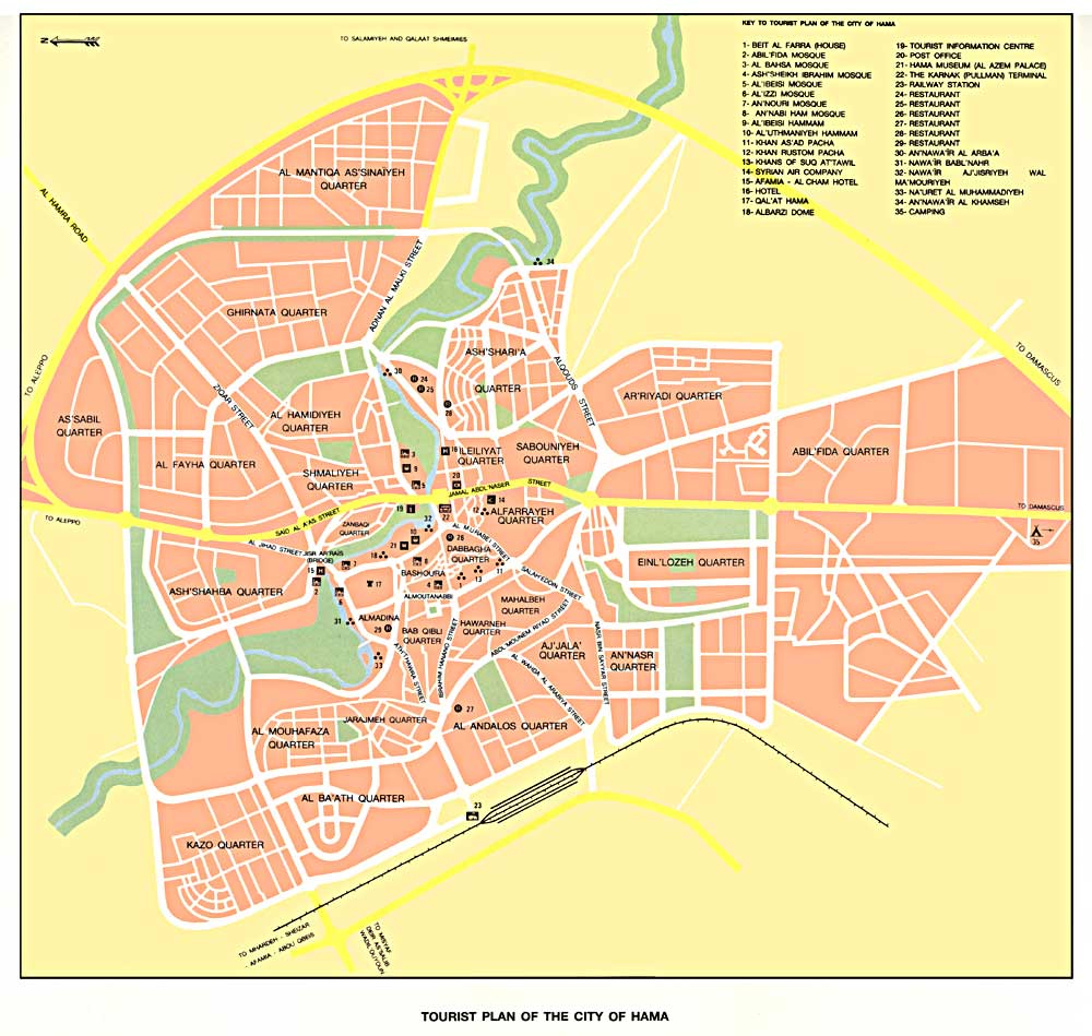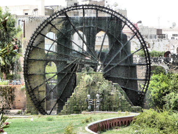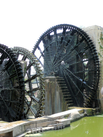 Hama es conocida por sus ruidosas norias de madera a orillas del río, que datan de la época romana. El agua era sacada del río Orontes, subiéndola hasta el acueducto que irrigaba toda la ciudad, desde donde se distribuía en canales menores que regaban los campos cercanos. Se construyeron hasta treinta gigantescas norias, de las que aún quedan diecisiete, que en algunos casos superaban los veinte metros de diámetro. Hama es una ciudad tranquila, la más bonita de Siria probablemente, y un lugar agradable desde donde explorar los múltiples restos arqueológicos del valle Orontes.