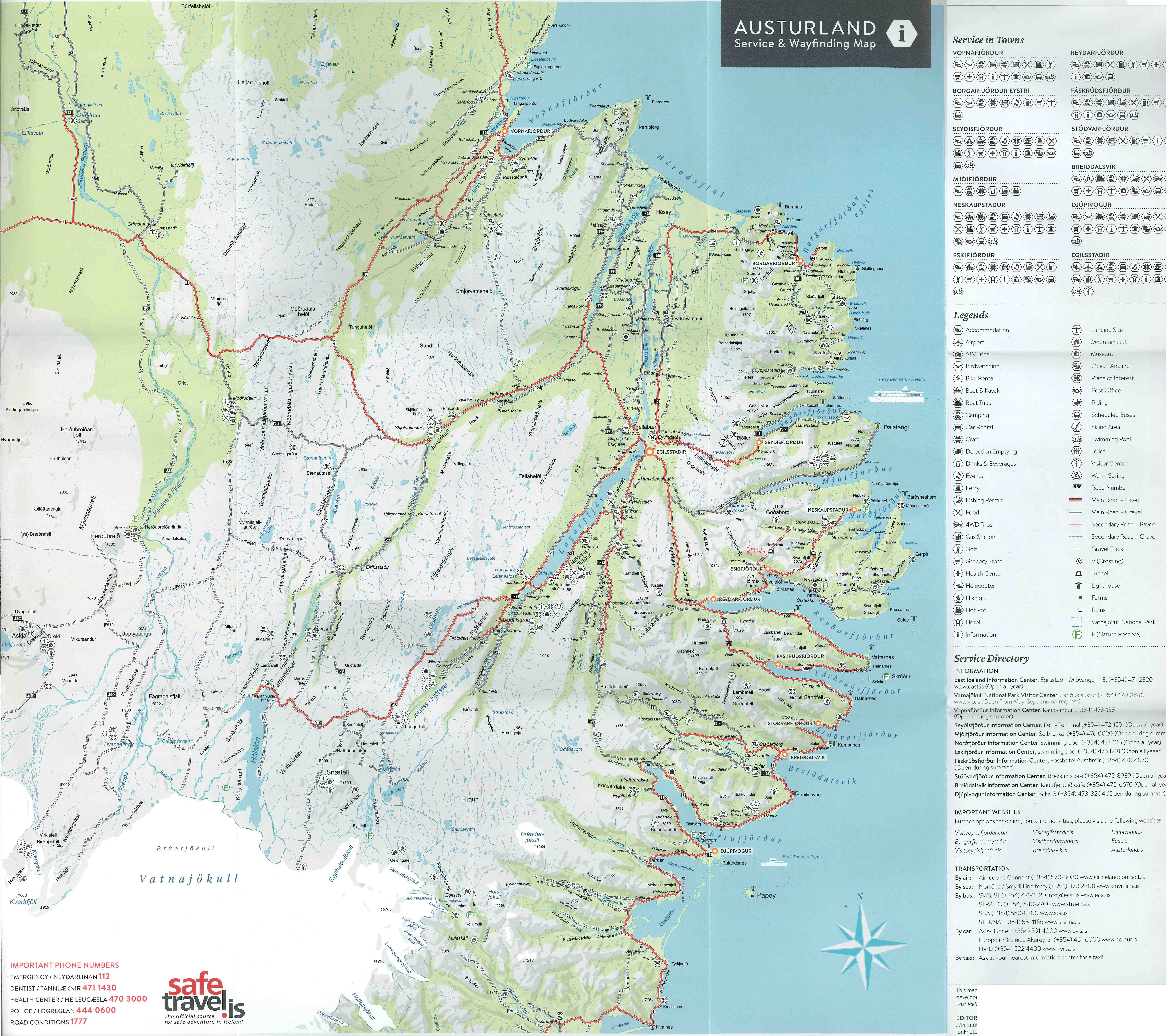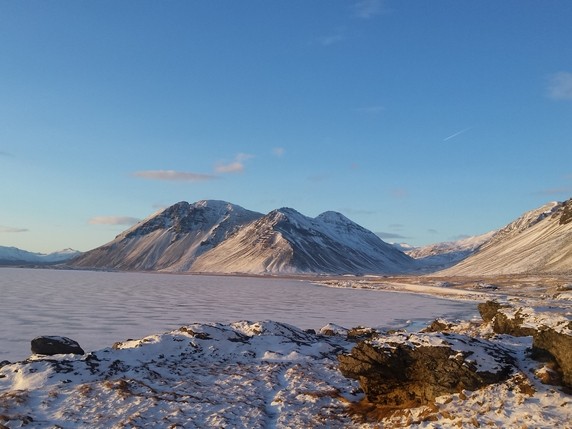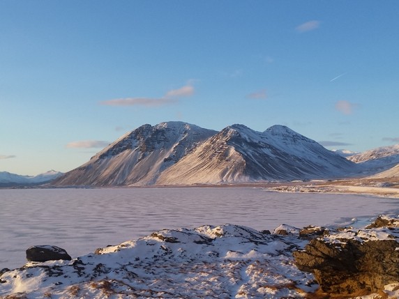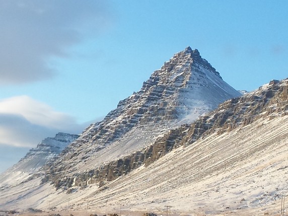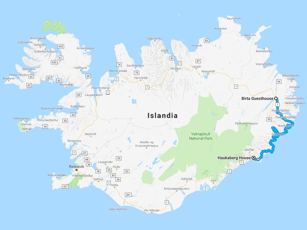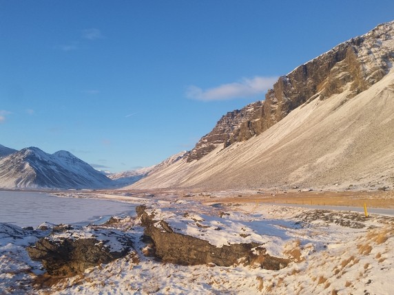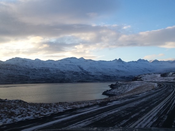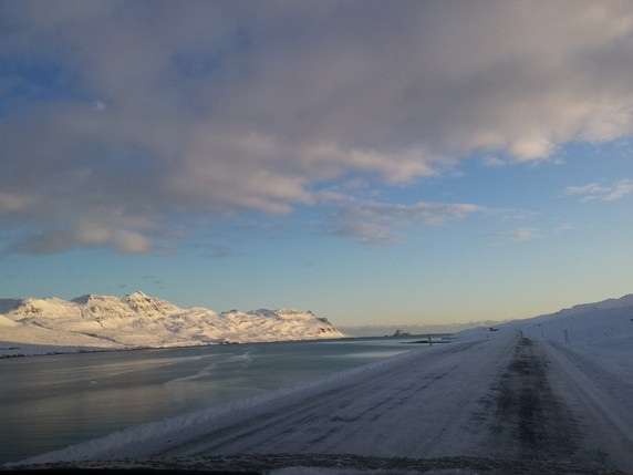 Hay que volver a Egilsstaðir para tomar la Ring Road, que lleva hacia el sur hasta Reyðarfjörður. Bordeamos la costa, entrando y saliendo en más de media docena de fiordos, solo hay un puente en la bahía de Breidalsvík, hasta llegar a Höfn, situado en una pequeña península. Paramos a estirar las piernas en Stöðvarfjörður, un pequeño pueblo de 200 habitantes bajo el monte Hellufjall. Tomamos algo caliente en la cafetería del puerto. Todo el trayecto nos acompaña el mismo paisaje, a un lado el mar, que de tanto en tanto entra tierra adentro convertido en fiordo, y al otro las montañas nevadas. Esta es la zona más tranquila y menos poblada del sur del país, solo cruzamos algunos grupos de casas, núcleos urbanos dodnde no viven más de 200 habitantes, y algunas granjas aisladas.