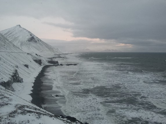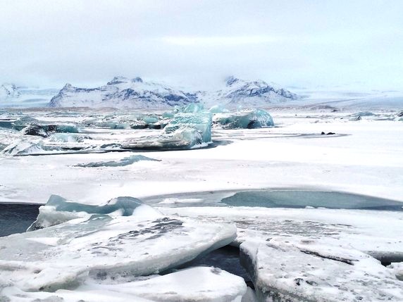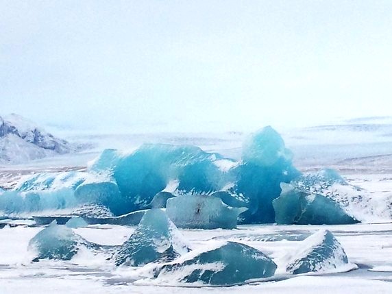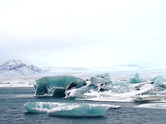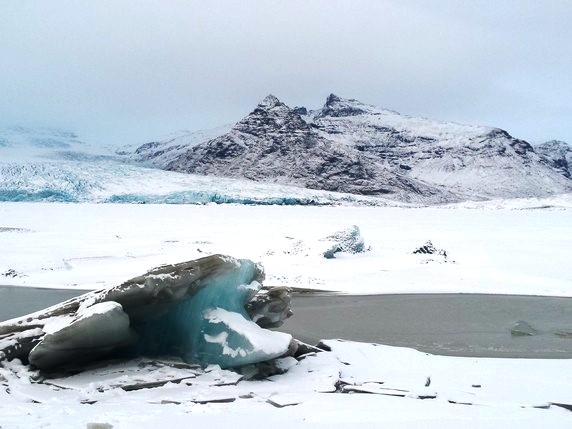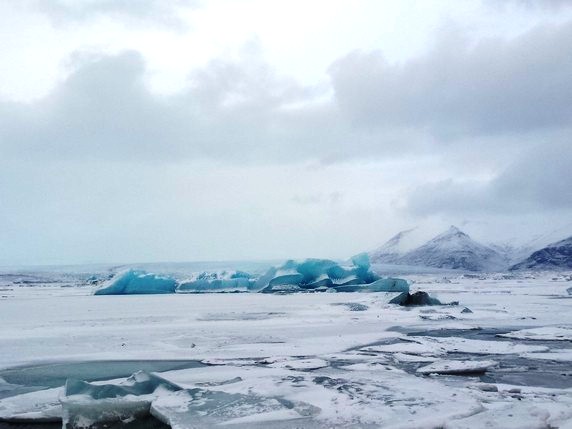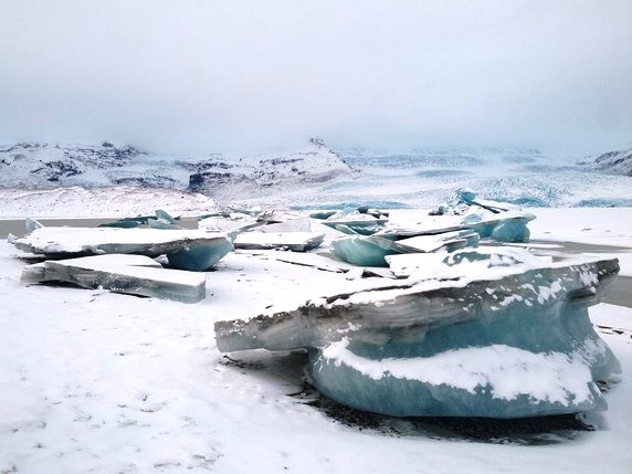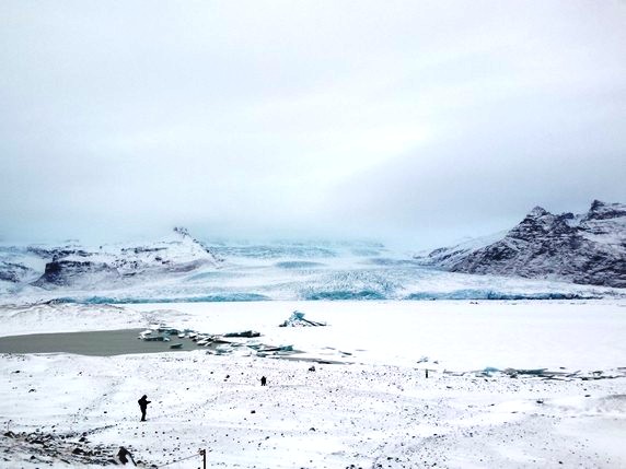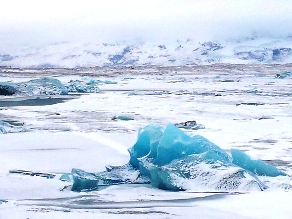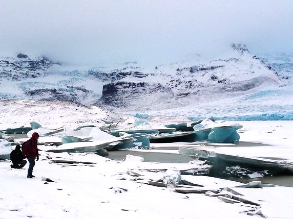 2 que en algunos puntos alcanza los 900 mts de altura. Bloques de hielo de diferentes tamaños, algunos alcanzan los 30 mts, se desprenden del glaciar y navegan por el lago, produciendo una bonita gama de colores entre el negro de la arena volcánica, el azul turquesa del hielo y el intenso manto blanco de nieve que lo rodea todo. Aunque la mayoría de icebergs se deshacen por el camino, algunos de ellos son arrastrados hasta el mar, donde quedan varados en la playa de arena negra volcánica. En su camino se cruzan con algunas focas y gaviotas que parecen compartir zona de abundante pesca. Aunque en temporada alta es posible recorrer el lago en bote hinchable, la única opción en invierno es caminar por los márgenes, siguiendo un sendero marcado por estacas que delimita las zonas donde el hielo puede quebrarse. Hace viento y frío, pero compensan las vistas del lago y el glaciar al fondo, que son impresionantes.