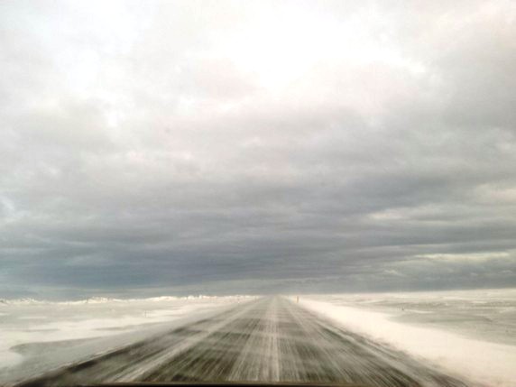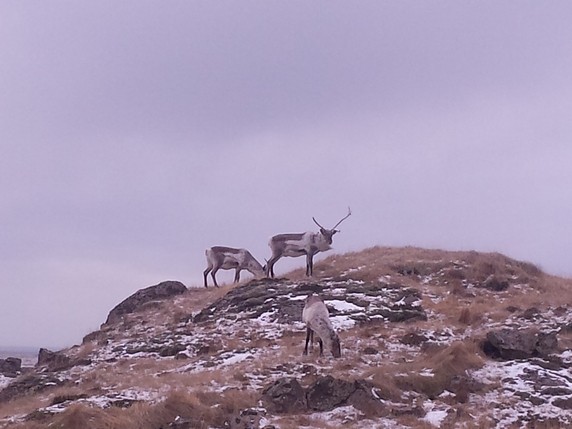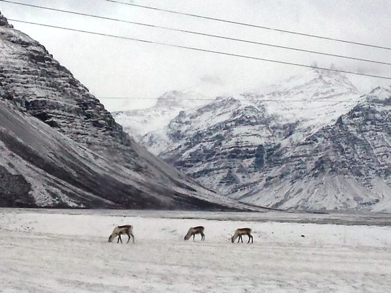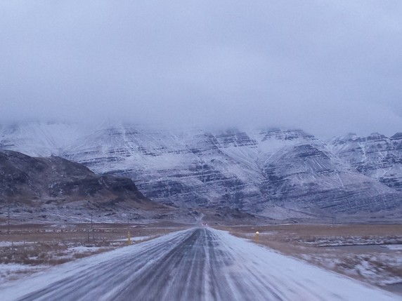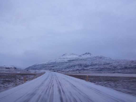 Egilsstaðir a por nuestro Dacia Duster. Espero que hayan arreglado la llave en Reykjavik y enviado de vuelta en avión. El camino es un poco pesado, son unos 240 km que se hacen en 4h más o menos. La carretera recorre un sin fin de fiordos de la costa este, y aunque el primer tramo de carretera está limpio de nieve, no se pueden coger grandes velocidades, pues hay bastantes renos y cruzan a sus anchas la calzada en busca de pasto bajo la nieve. La primera hora es relativamente tranquila; las dos siguientes hay intervalos de nieve, niebla y hielo en la calzada; y la última hora antes de