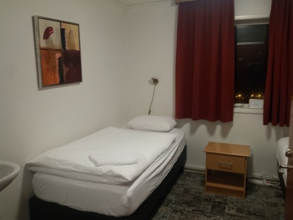 Höfn HI Hostel, 6.360 ISK. A 10 minutos andando del centro, cerca de la gasolinera N1. Habitación pequeña con dos camas, mesita de noche, colgadores detras la puerta y lavamanos. Las maletas hay que dejarlas a los pies de la cama, y el baño es compartido. Hay una zona común con mesas y revistas, una amplia cocina dotada con todo lo necesario, comer con una docena de mesas, y ofrece té, café y zumos de naranja o manzana gratis durante todo el día. Aunque la habitación podía ser más grande, es un lugar limpio y agradable, con buen servicio, donde no dudaría en volver. Frente a él se puede aparcar sin problema. Desayuno no incluido.