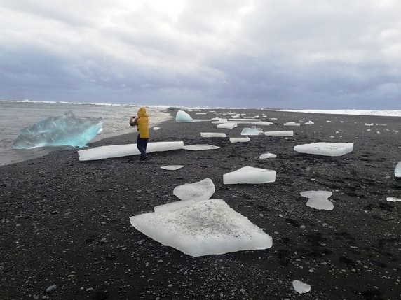2, donde grandes bloques de hielo desprendidos del glaciar navegan a la deriva. Algunos de ellos quedan atrapados en la orilla, y es fácil acercarse a ellos, aunque hay que ir con mucho cuidado pues no es fácil distinguir cuando hay tierra o agua porque todo está cubierto de nieve. El fondo volcánico le da al agua un tono negruzco que, en contraste con la nieve, hace que los azules de algunos trozos se vean aún más intensos. Solo hay dos coches en el parquing, junto al que hay un pequeño restaurante, desde donde hay que caminar 500 mts para llegar al lago.